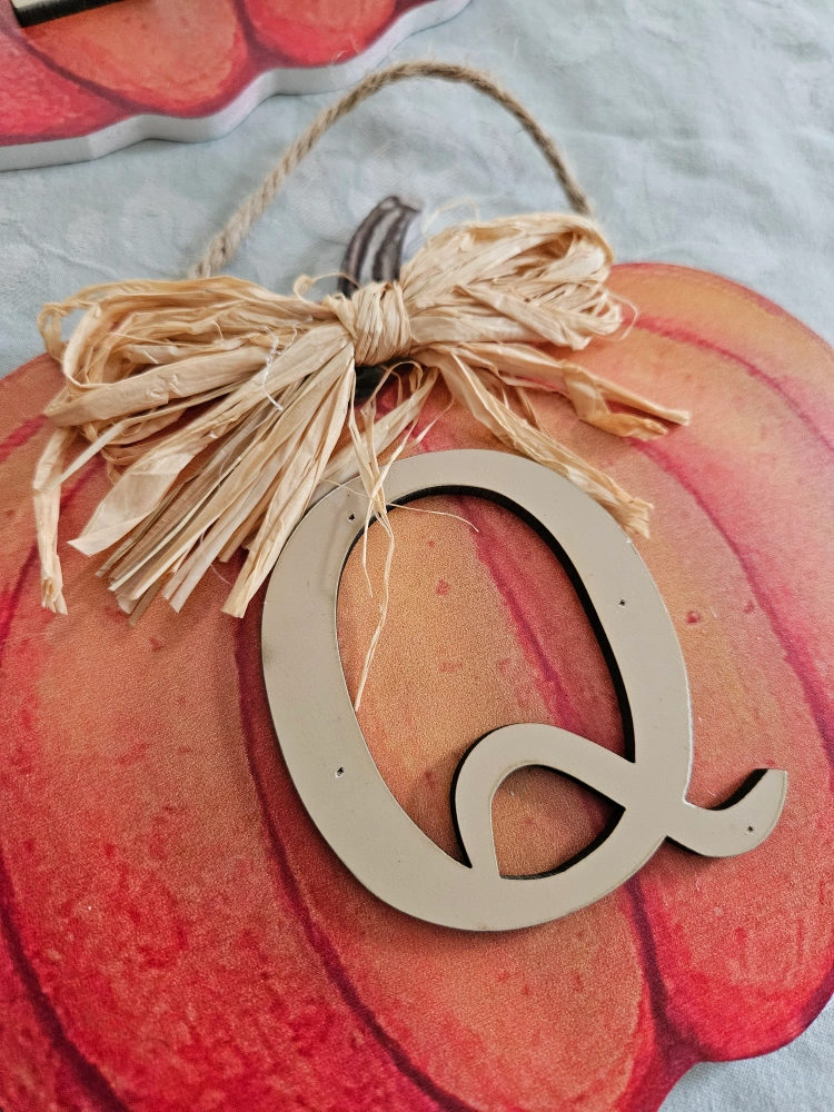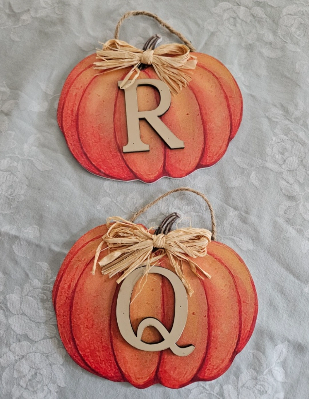 Set of two autumnal pumpkin decorations. Features letters Q and R. Made of wood. Has a raffia bow. Perfect for fall decorating. New, never used