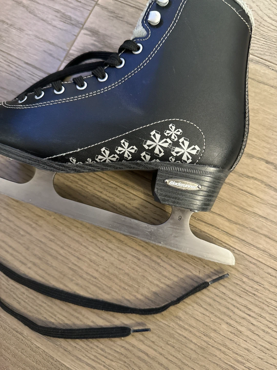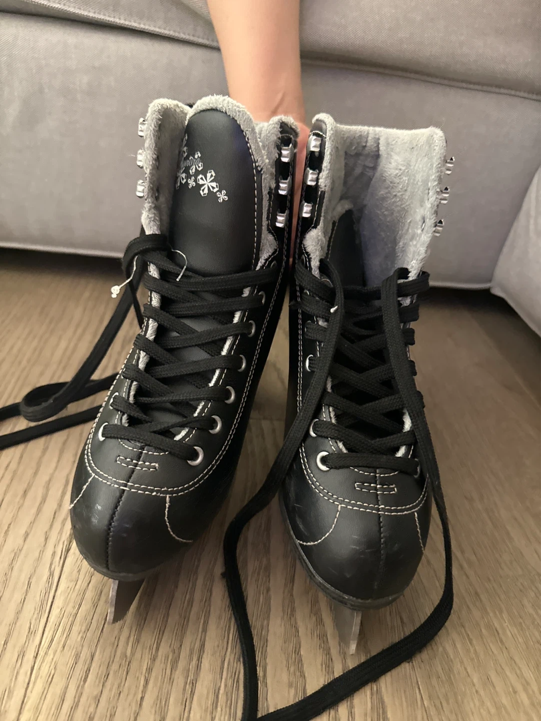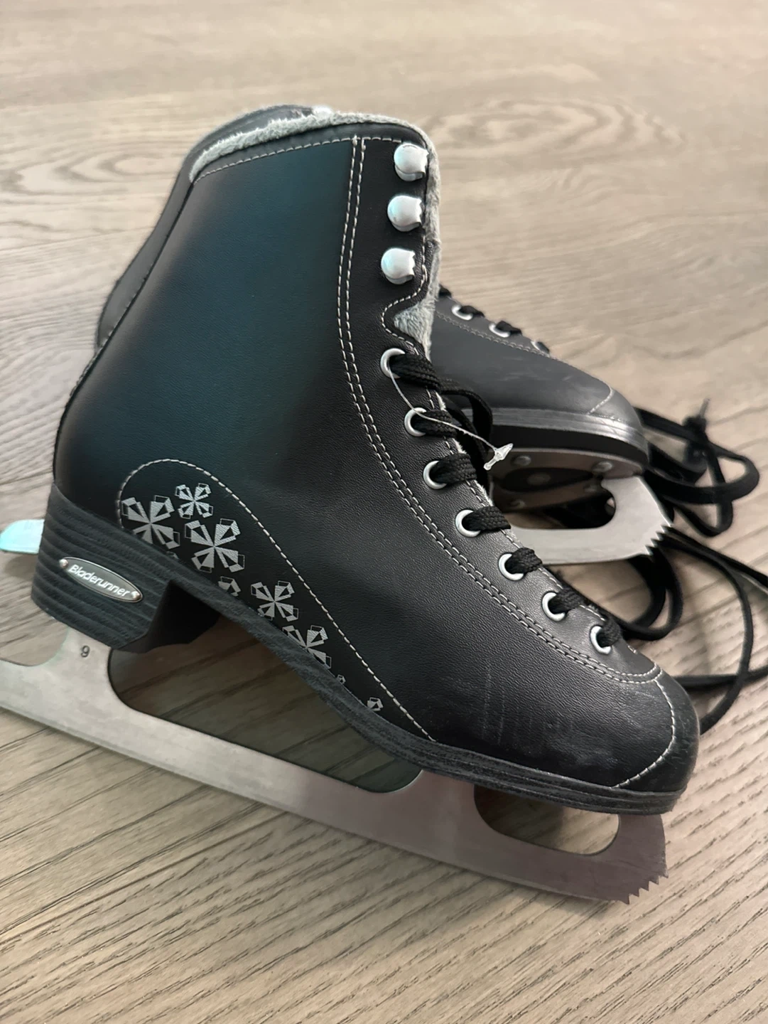Black figure skates with a soft, grey fuzzy lining for warmth. Decorated with snowflake accents on the sides. Includes metal blades and black laces.