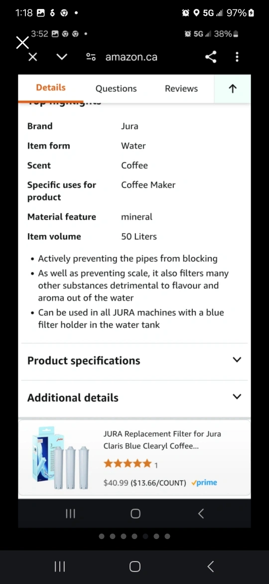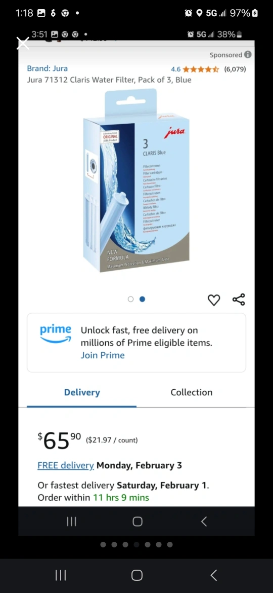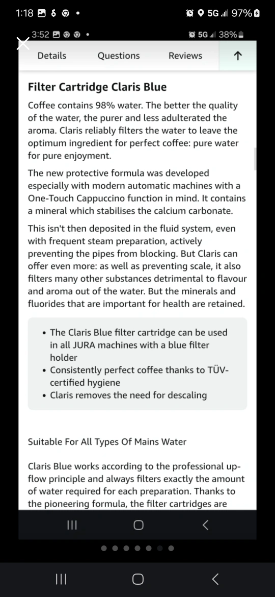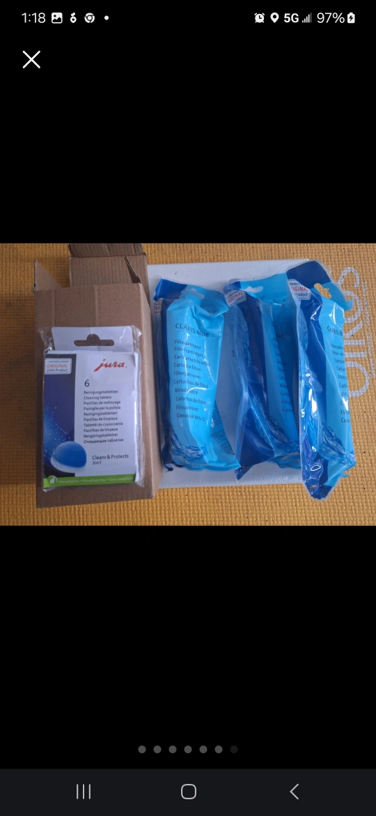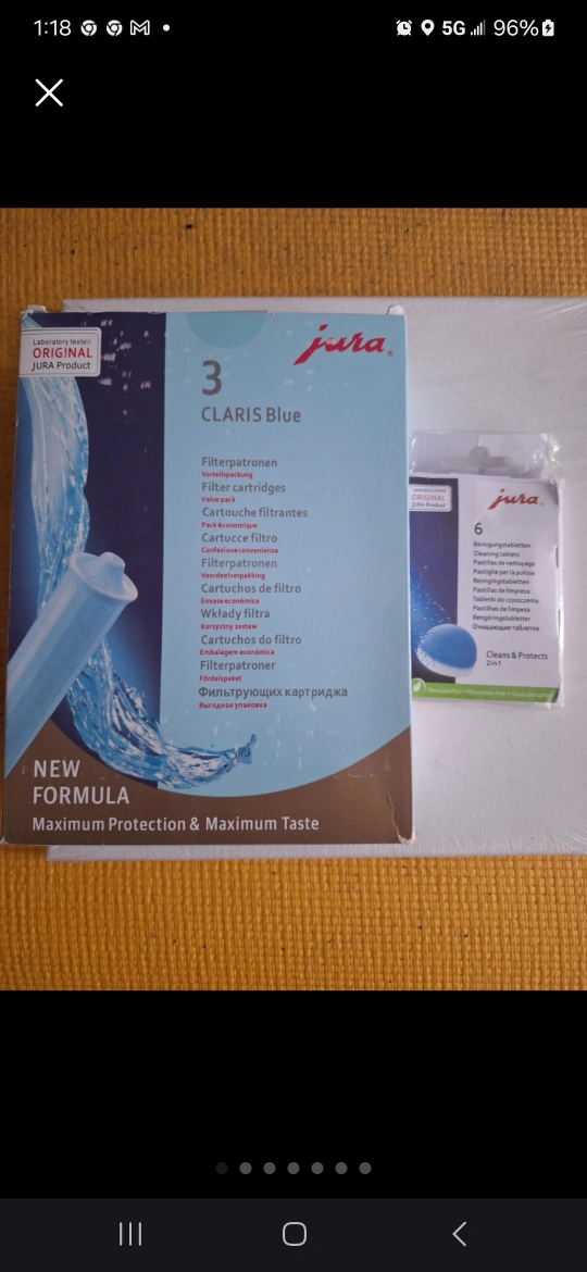 New formula Jura Claris Blue water filter cartridges. Maximum protection and maximum taste. Three filter cartridges and cleaning tablets included. Filters up to 50 litres of water. 2 months.