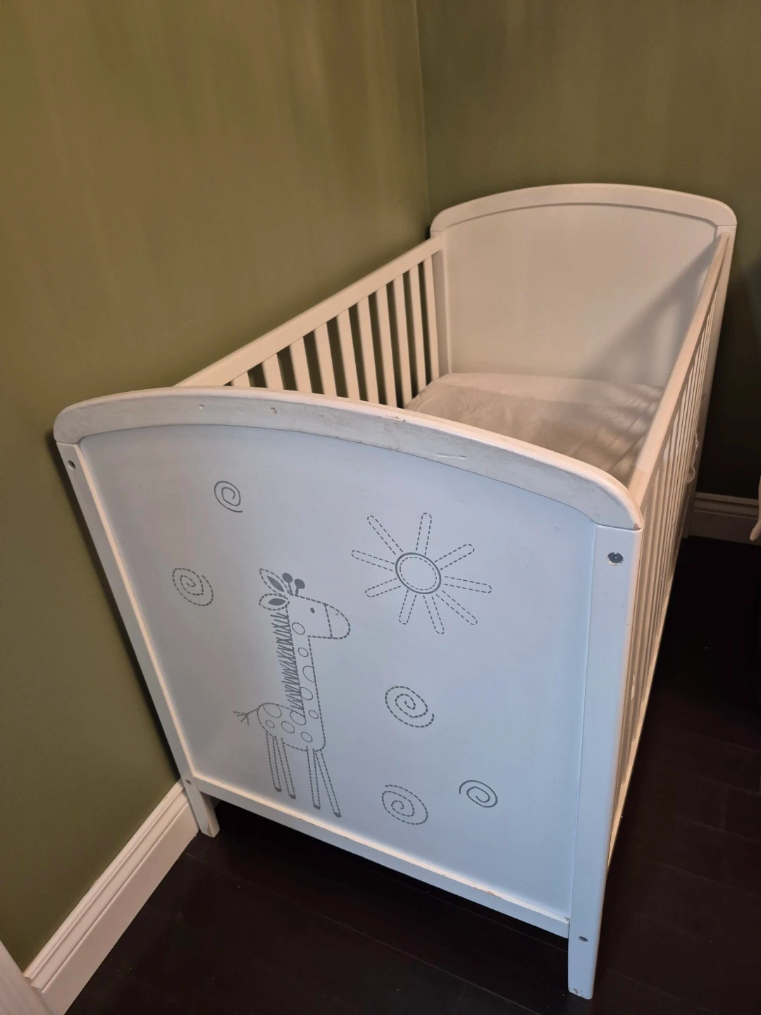 This is a white baby crib with a cute giraffe and sun design on the side panel. It has sturdy wooden construction with slatted sides. Mattress included.