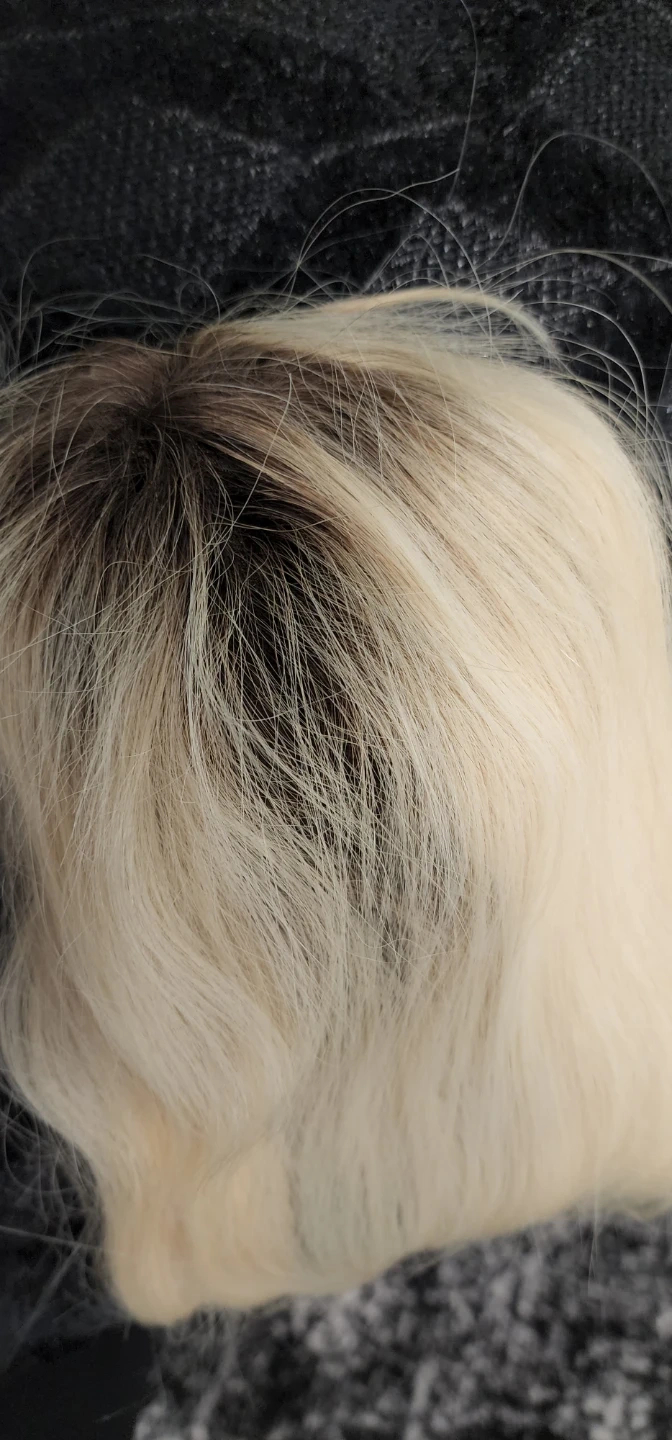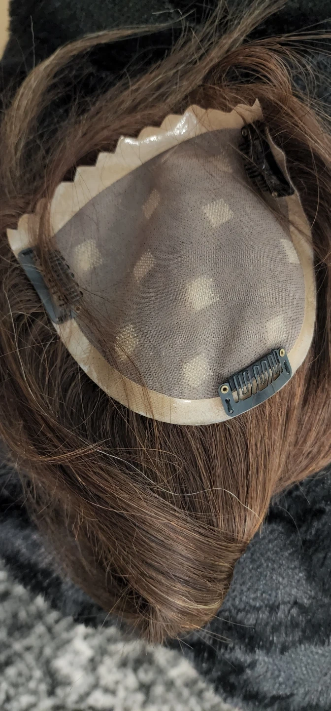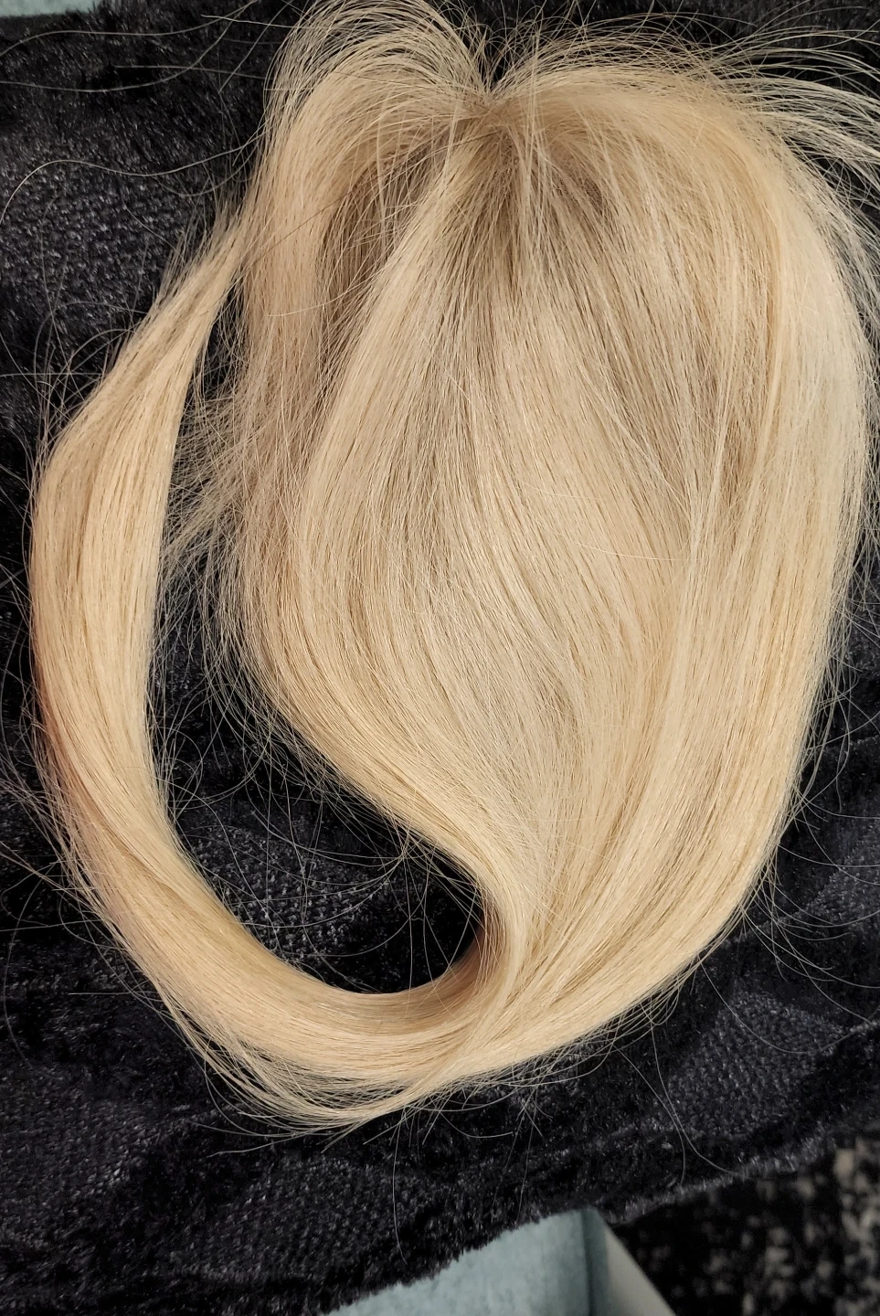 This is a blonde hair topper, designed for clip-in application. Can be dyed and styled as it's a natural hair. It provides natural-looking volume and coverage. The base is a breathable mesh with secure clips attached.