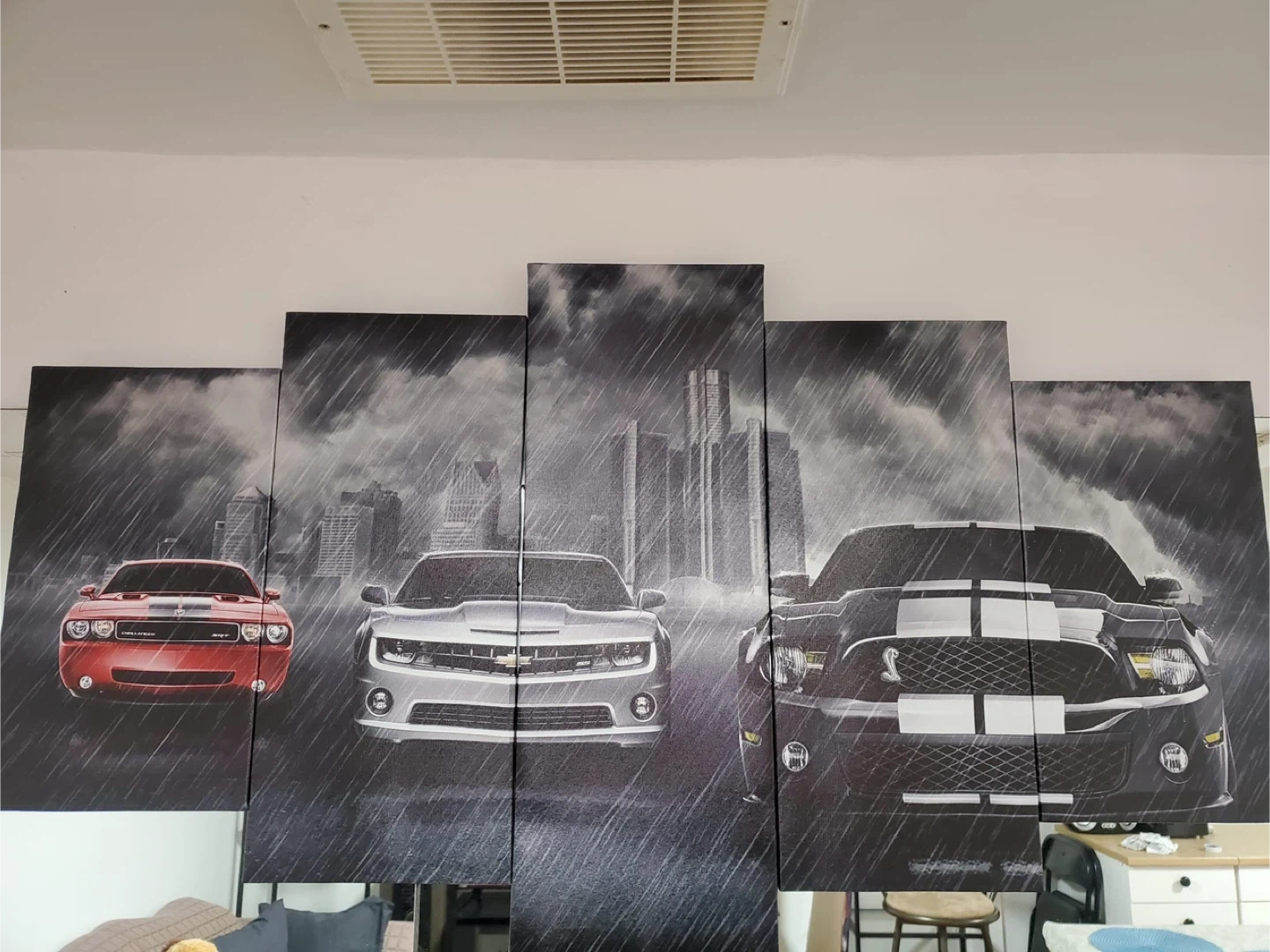 This canvas print features a triptych of muscle cars in the rain. It showcases a red Dodge Challenger, a silver Chevrolet Camaro, and a black Ford Mustang Shelby GT500. The artwork depicts a city skyline in the background. It's great for a garage or man cave!