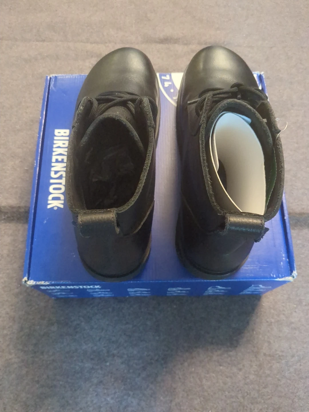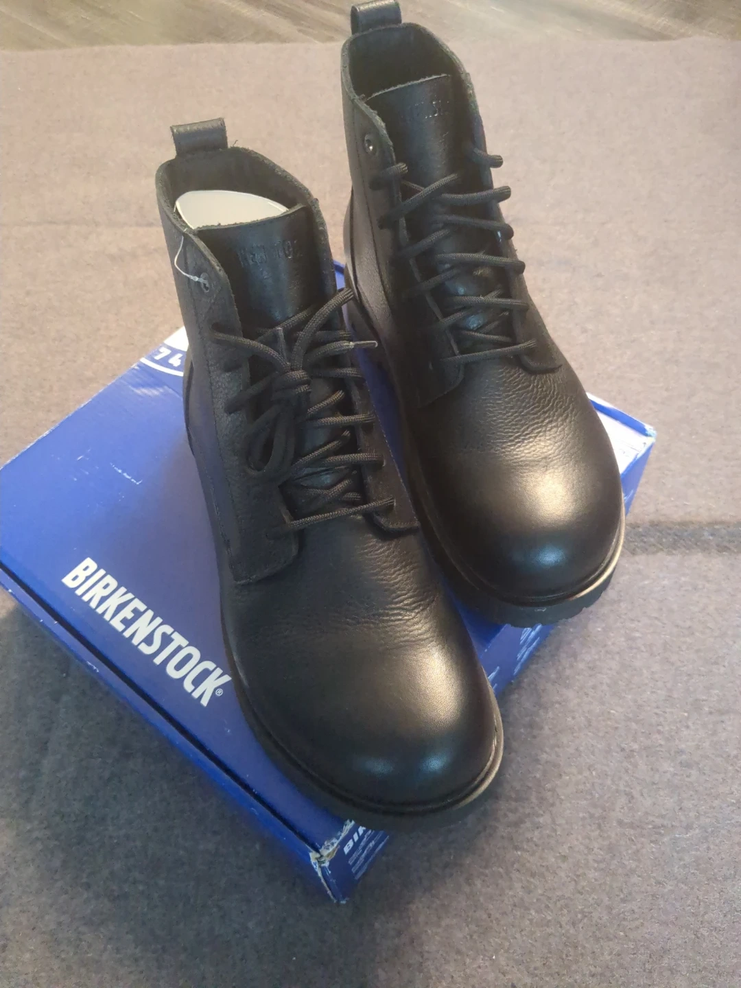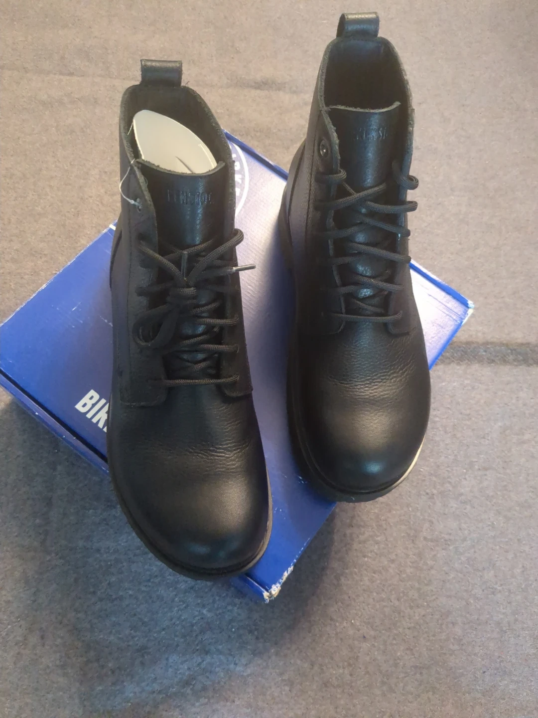 These are Birkenstock black leather lace-up boots. They feature a durable sole and comfortable construction. These boots are great for everyday wear. Size 44 US 11