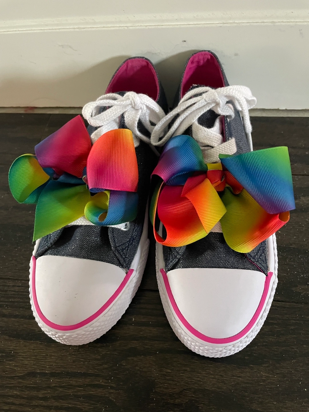 Cute Jojo Siwa sneakers. Denim fabric, rainbow bow. Size 3. New in box. Porch pick up Yonge and 16th