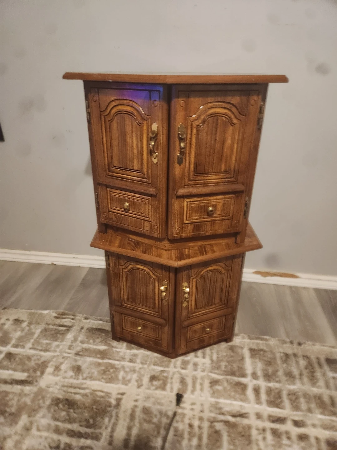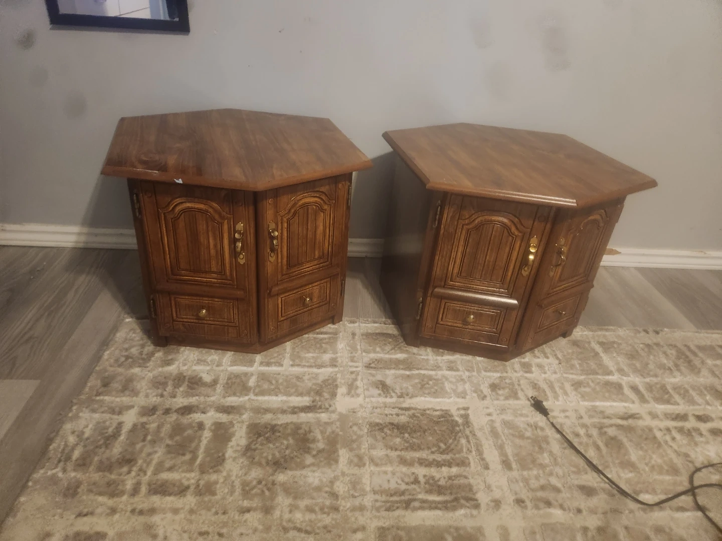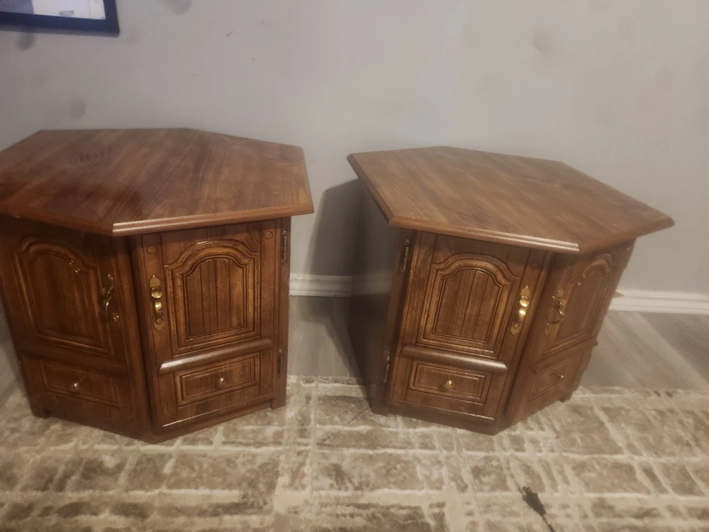 A set of two vintage wooden corner cabinets. Each cabinet features a paneled door and a drawer for storage. Rich wood finish with brass hardware. They're great for adding extra storage and a classic touch to any room!