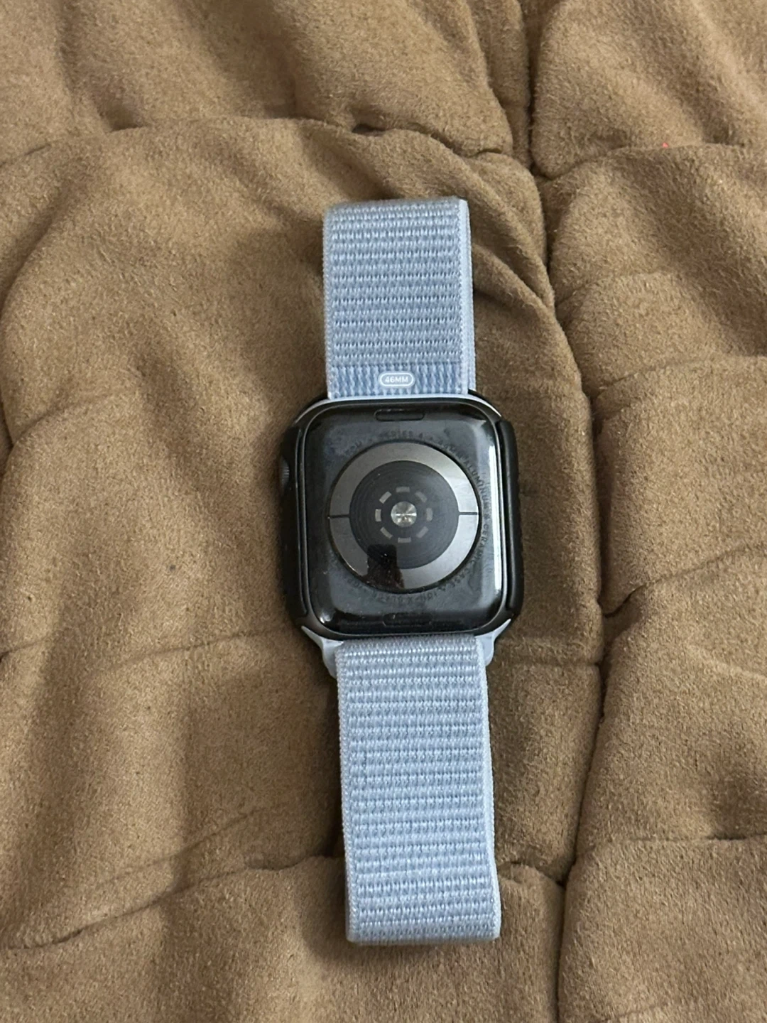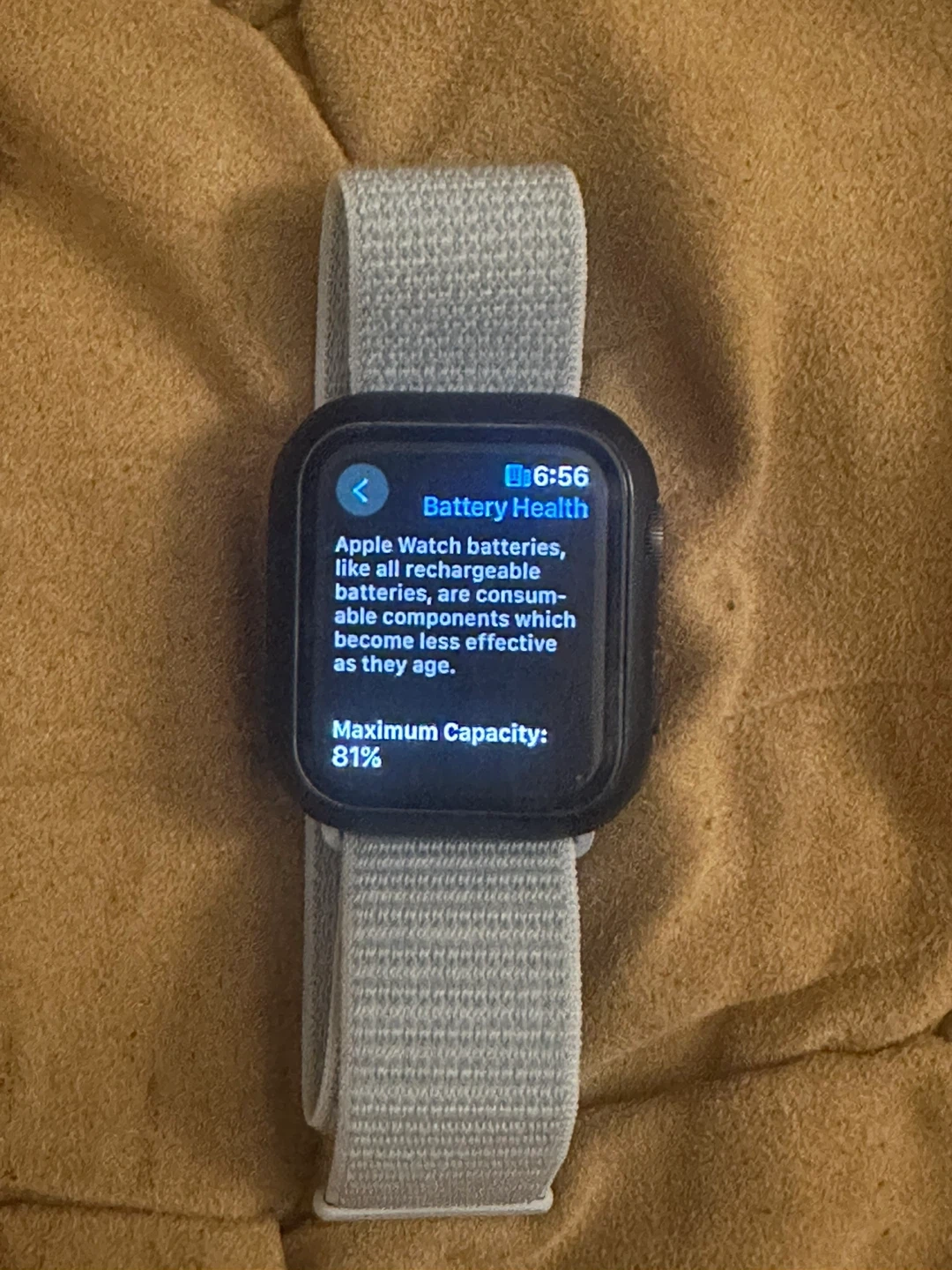 This is an Apple Watch Series 4 GPS model with a light blue sport loop band. The battery health is at 81% maximum capacity. It's a great smartwatch for tracking fitness and staying connected.