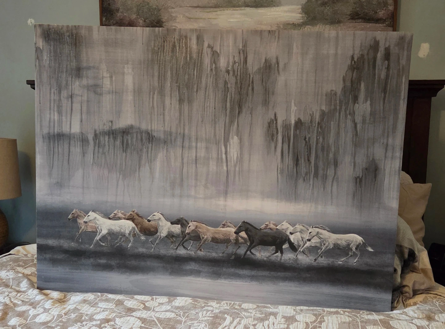 This is an original acrylic painting on canvas, depicting a herd of horses running. The artwork features a monochromatic palette with shades of grey and white. It's a large statement piece for any home or office. Size: 40" wide x 30" height.