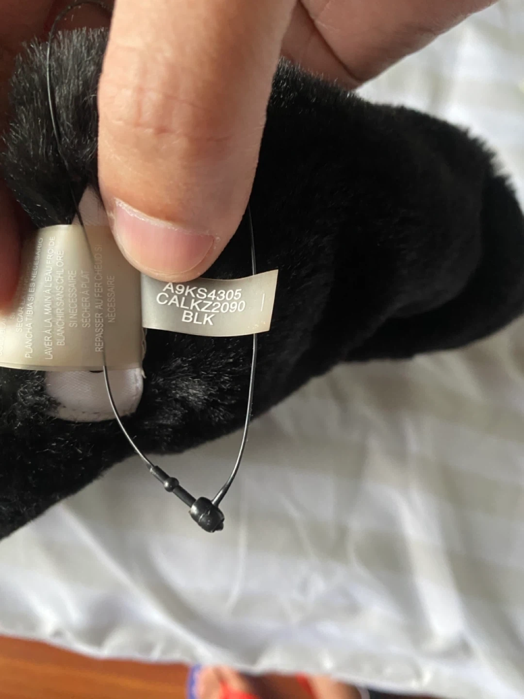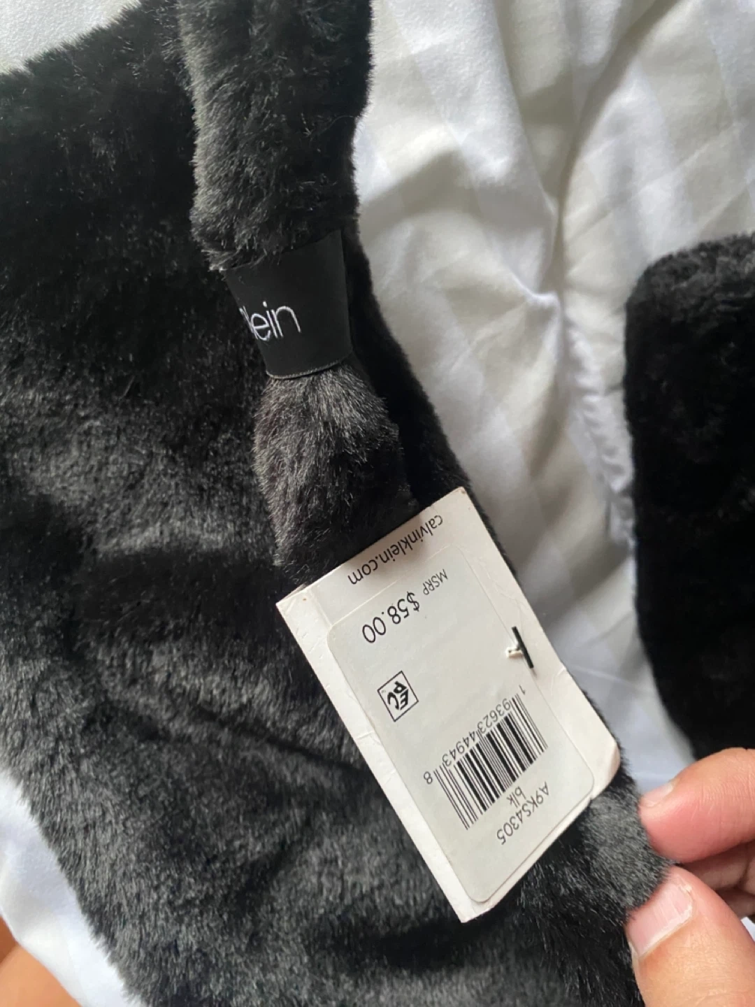 This is a black Calvin Klein scarf made of faux fur. It's 100% polyester. Perfect for keeping warm on chilly days!