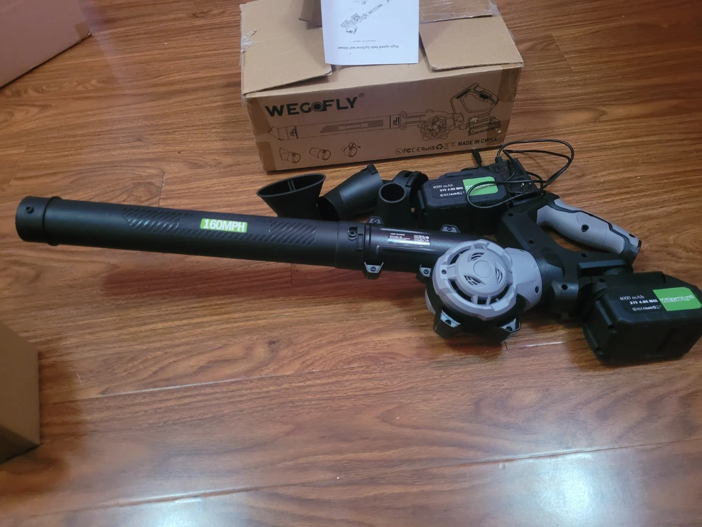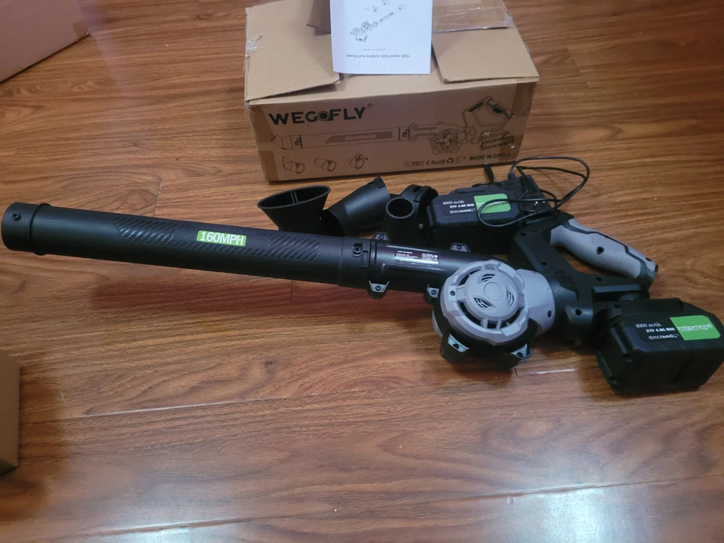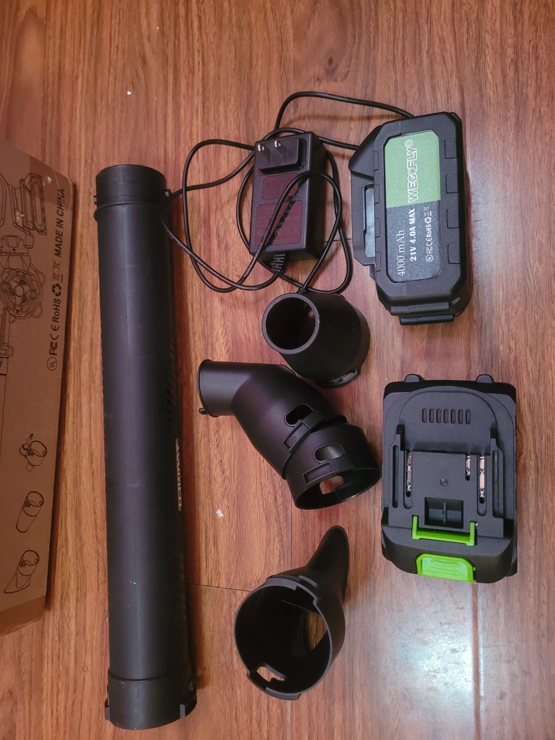 WEGOFLY cordless leaf blower with two 21V 4.0Ah batteries. Includes charger and multiple nozzle attachments. It offers 160 MPH wind speed.