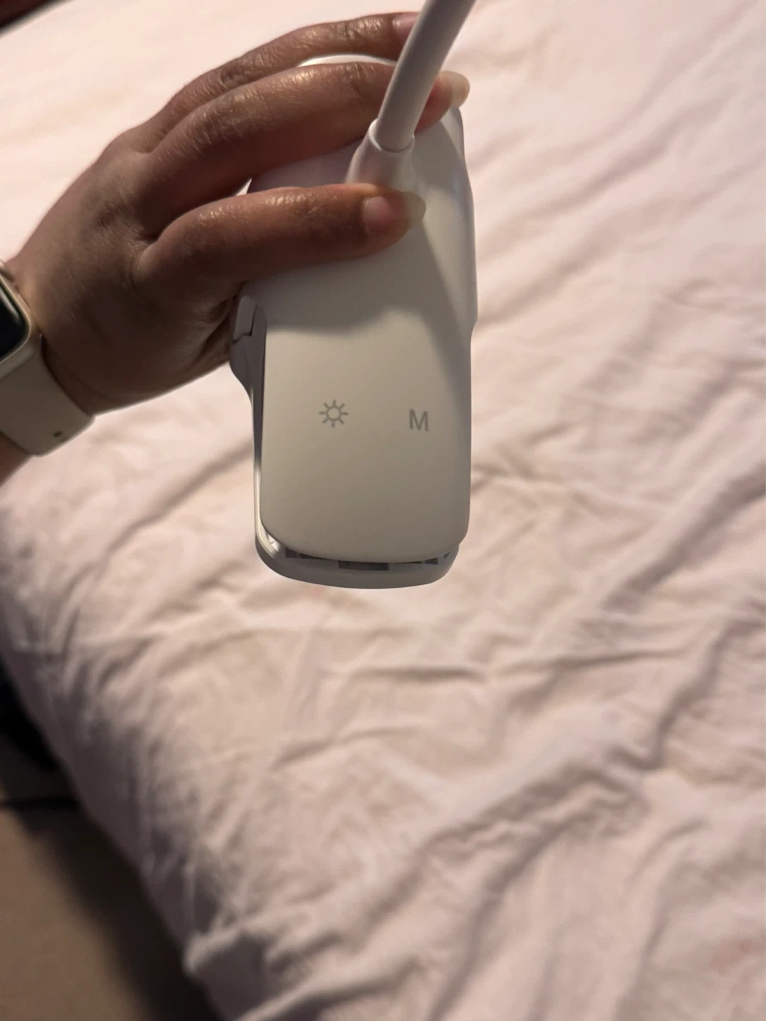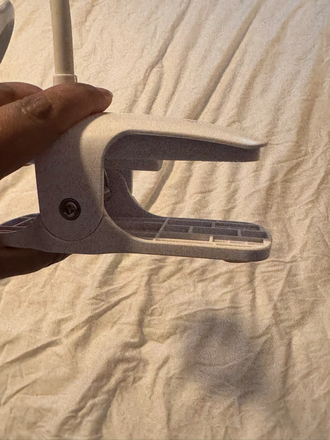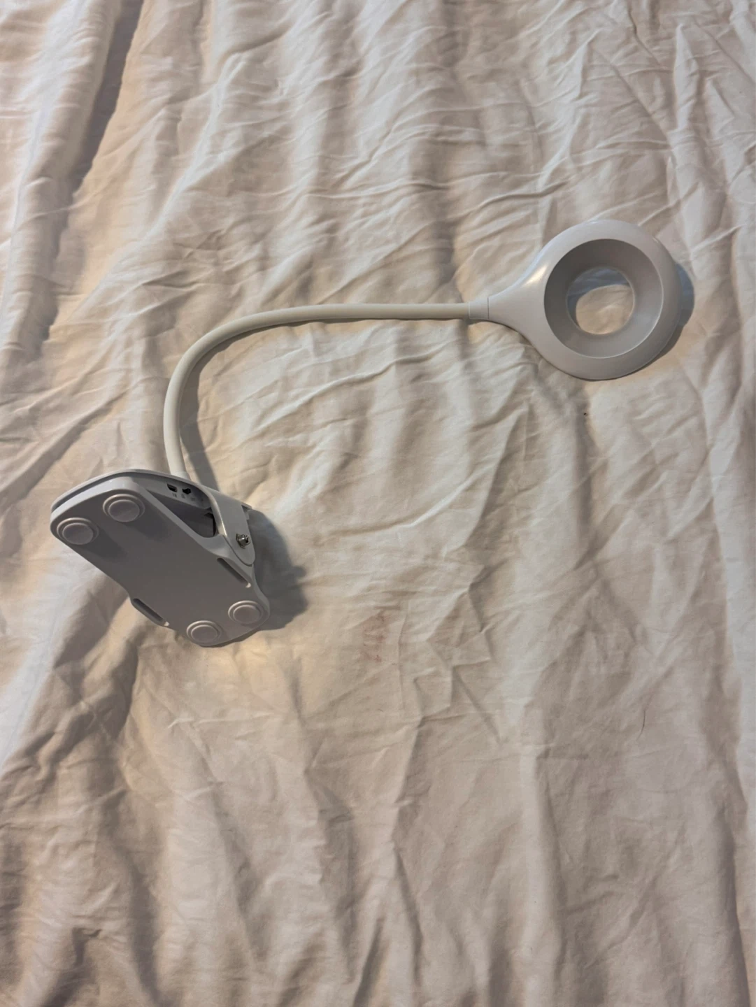 This is a white clip-on LED desk lamp with a flexible gooseneck. It features a USB charging port and an on/off switch. There are buttons for brightness adjustment and mode selection. It's great for reading or working at your desk.