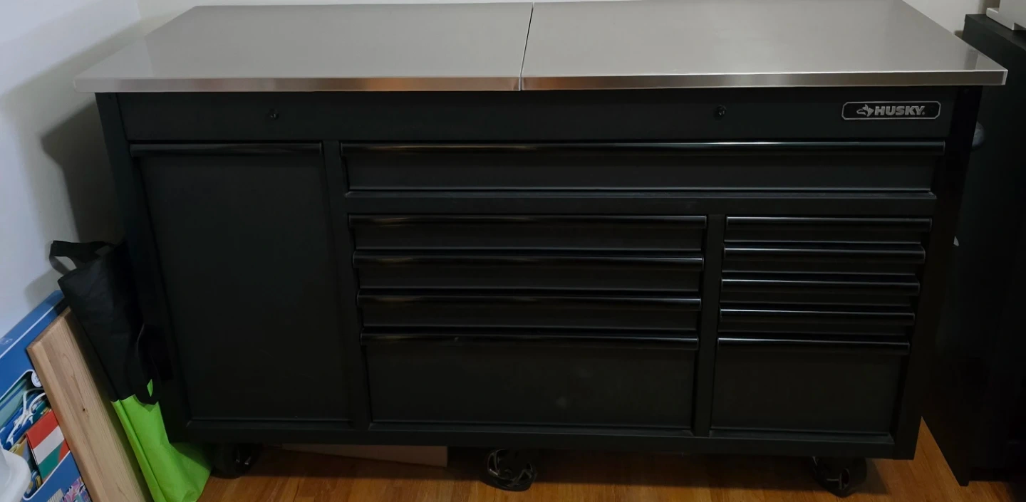 Black Husky rolling tool chest with stainless steel top. It's got multiple drawers for storage, perfect for a workshop or garage! Features heavy-duty casters for easy mobility.