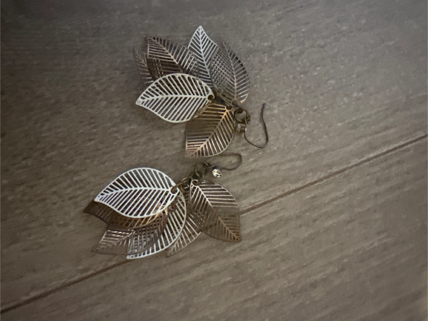 These lovely leaf drop earrings are made of metal. They feature an intricate, cut-out leaf design. A small clear bead is attached to each earring hook.