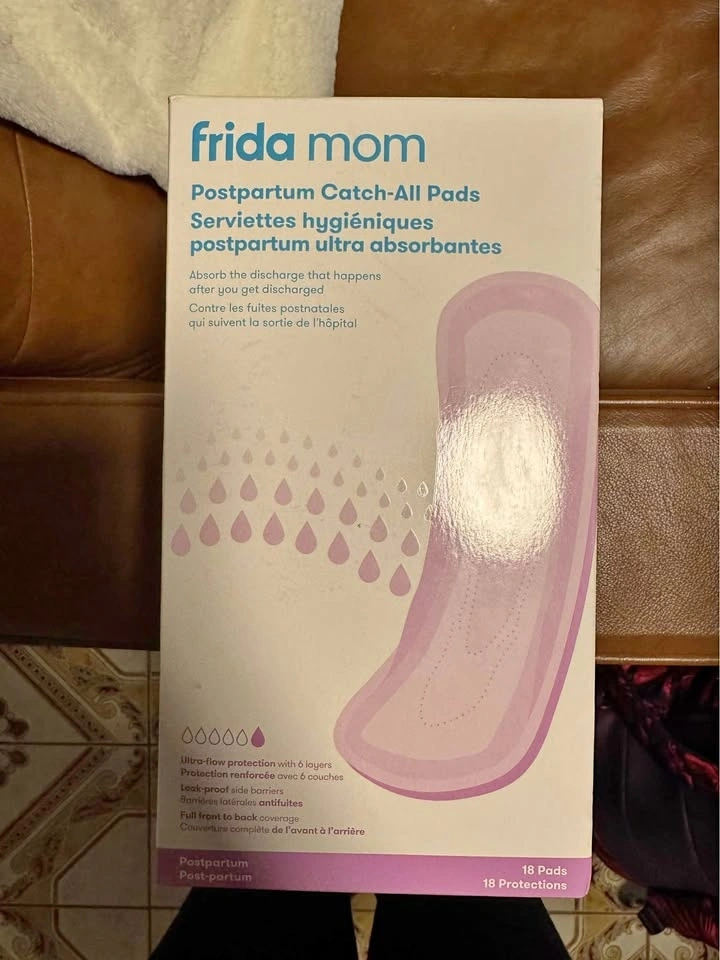 Super absorbent Frida Mom Postpartum Catch-All Pads. Box has 18 pads. These are great for after delivery and help absorb discharge. Features ultra-flow protection with 6 layers, leak-proof side barriers, and full front to back coverage.