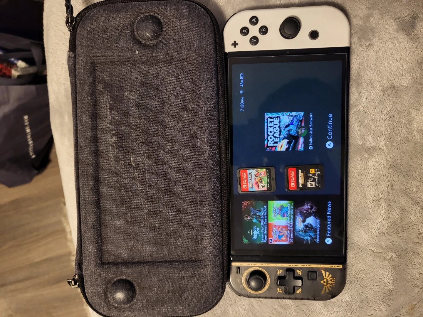 Nintendo Switch OLED Model console, white and black. Includes a grey protective travel case. This handheld gaming system is ready for adventures!