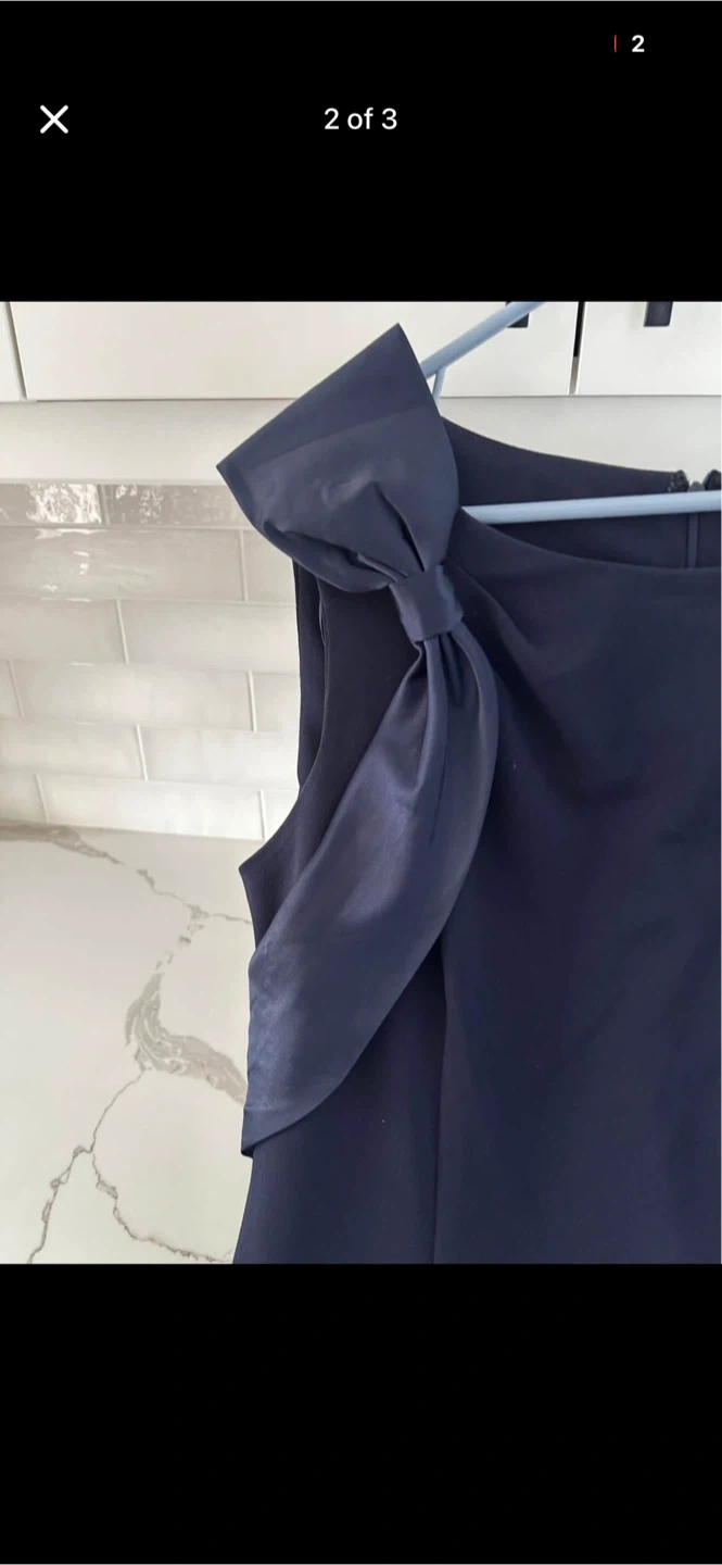 Sleeveless navy blue dress with a decorative bow on the left shoulder. It's a chic choice for various occasions. Zipper closure at the back.