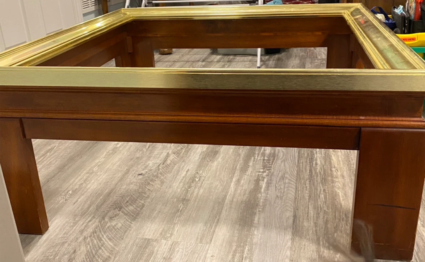 Selling a sturdy coffee table with a unique design. It features a rich wood finish and a striking gold trim. Tempered glass top. Perfect for adding a touch of elegance to your living room!