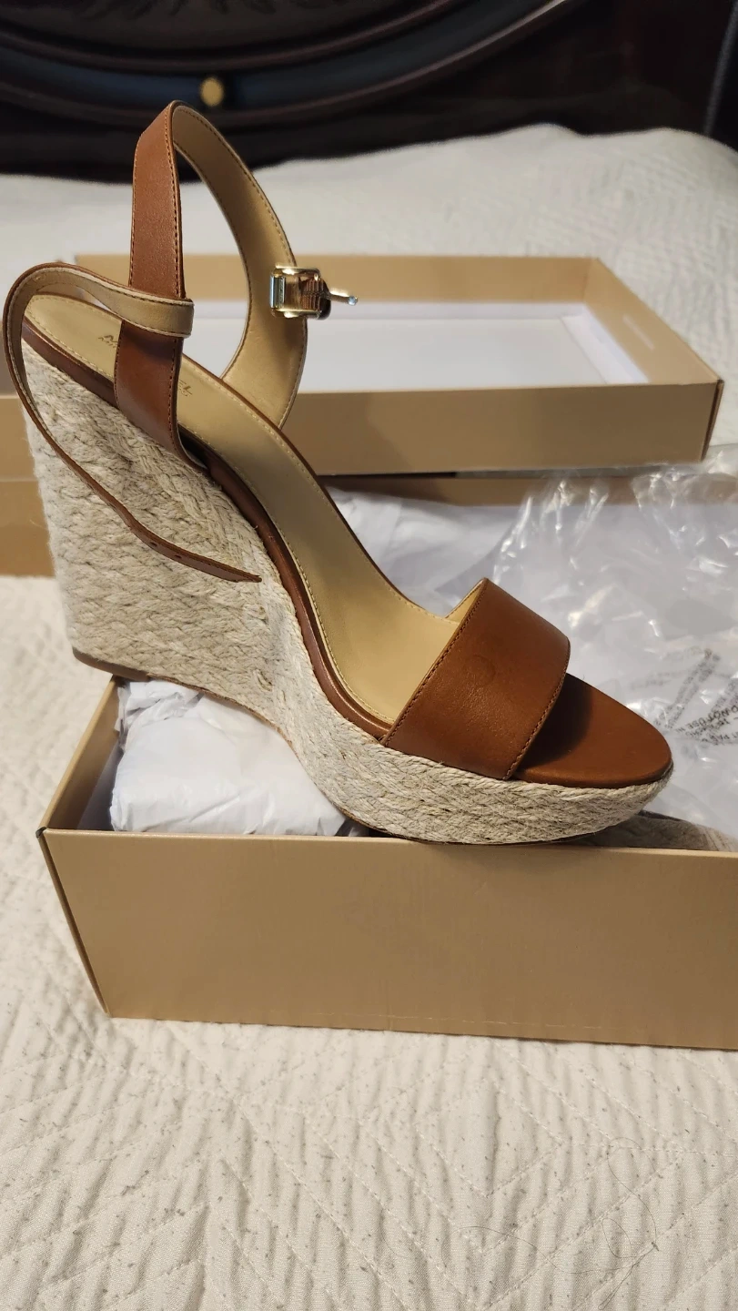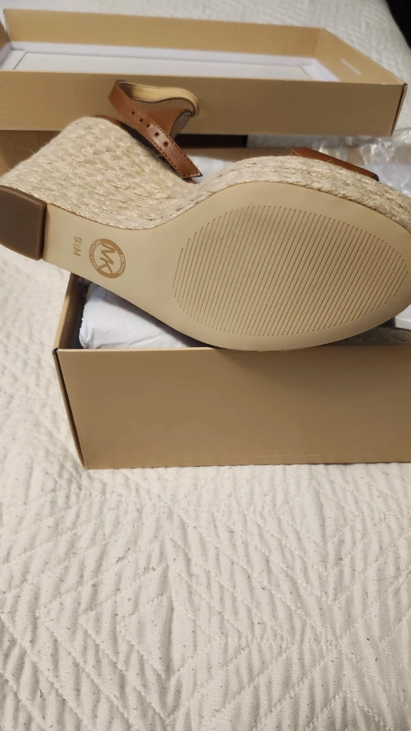 These Michael Kors wedge sandals are made with a brown leather upper and a jute espadrille sole. They have an adjustable ankle strap with a buckle closure. Includes original box.