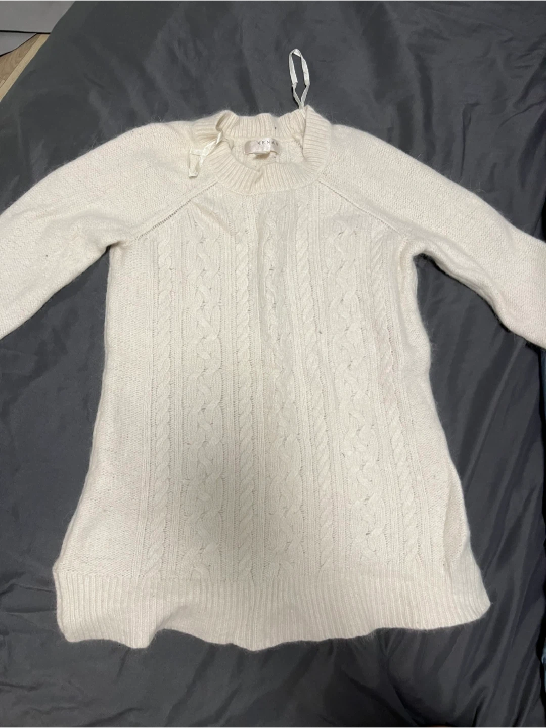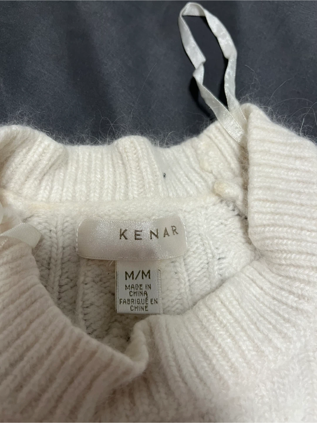 This cream cable knit sweater is from Kenar. It's a size M/M and made in China. It's perfect for staying cozy on cooler days!