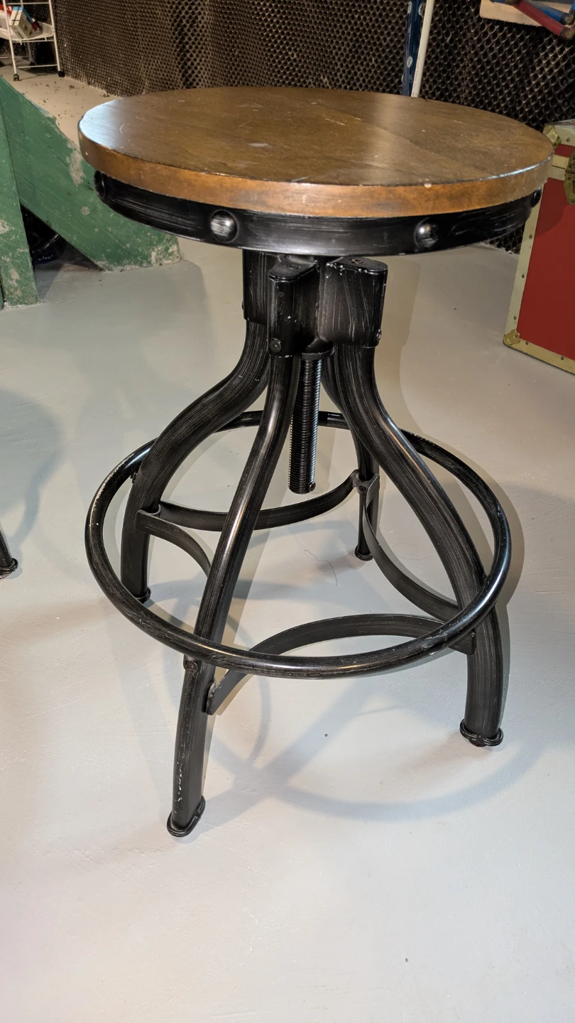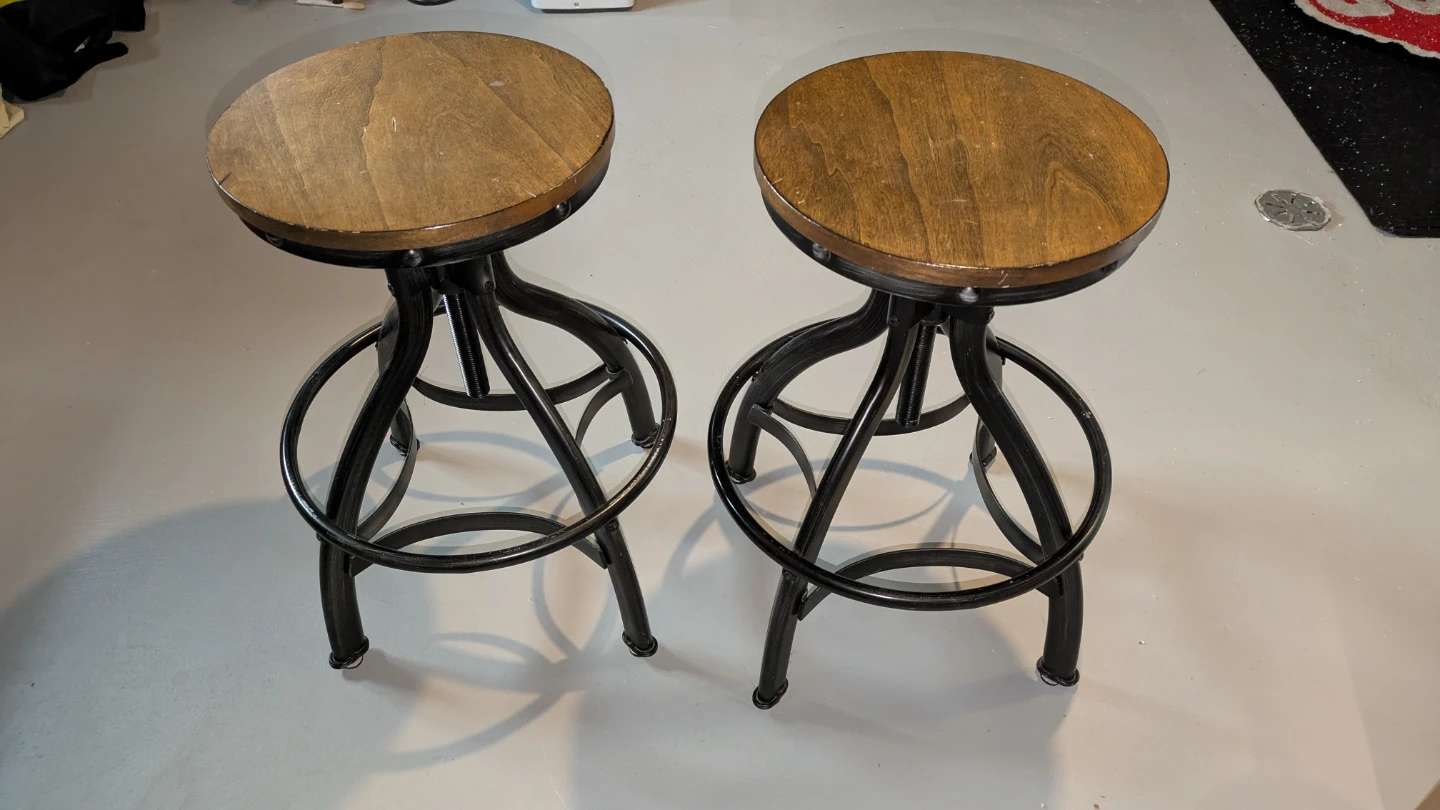 Selling a set of industrial-style bar stools! They have a cool, rustic look with a wooden seat and metal frame. The height is adjustable, making them perfect for a kitchen island or bar area. The seat diameter is about 14 inches.