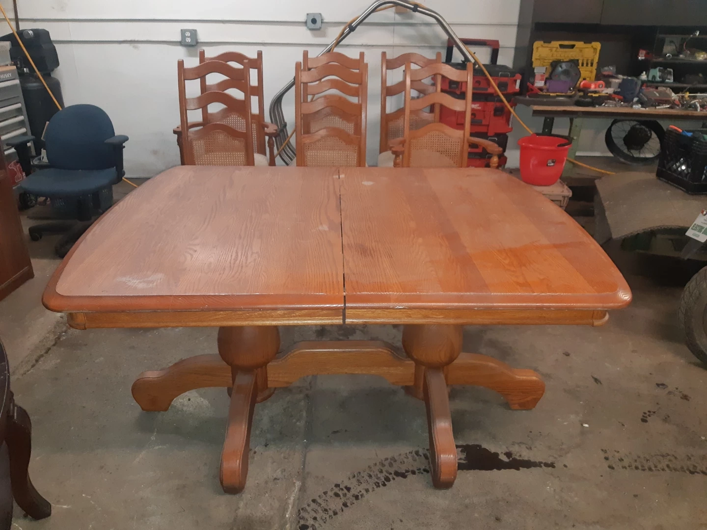 This is a solid wood dining table with a double pedestal base. It has a light oak finish and a refinished top. This table would be great for family dinners!