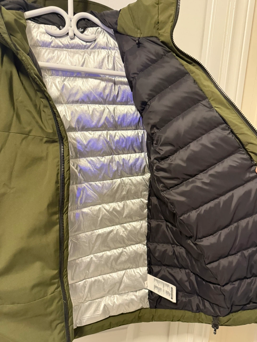 This All Weather jacket is olive green. It's made with 100% nylon fabric and 100% polyester lining. The filler is 90% duck down and 10% feathers. This jacket would be useful for keeping warm in cooler weather.