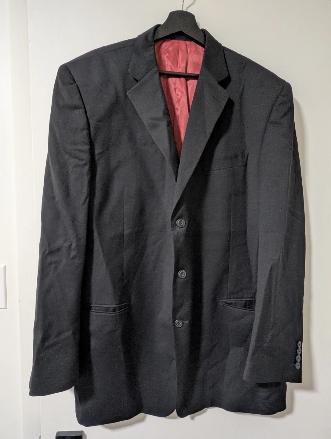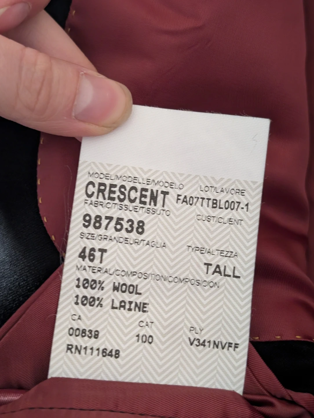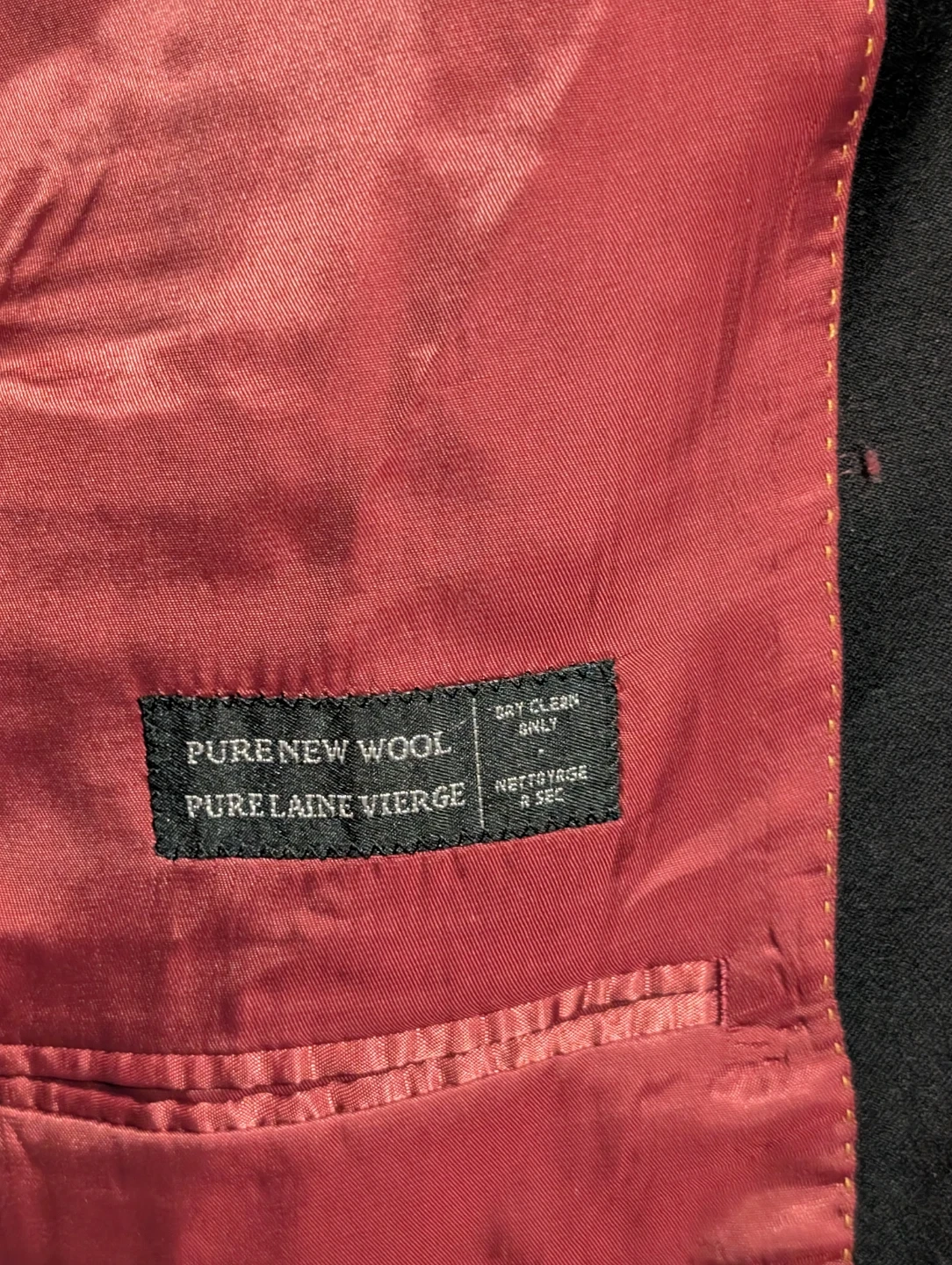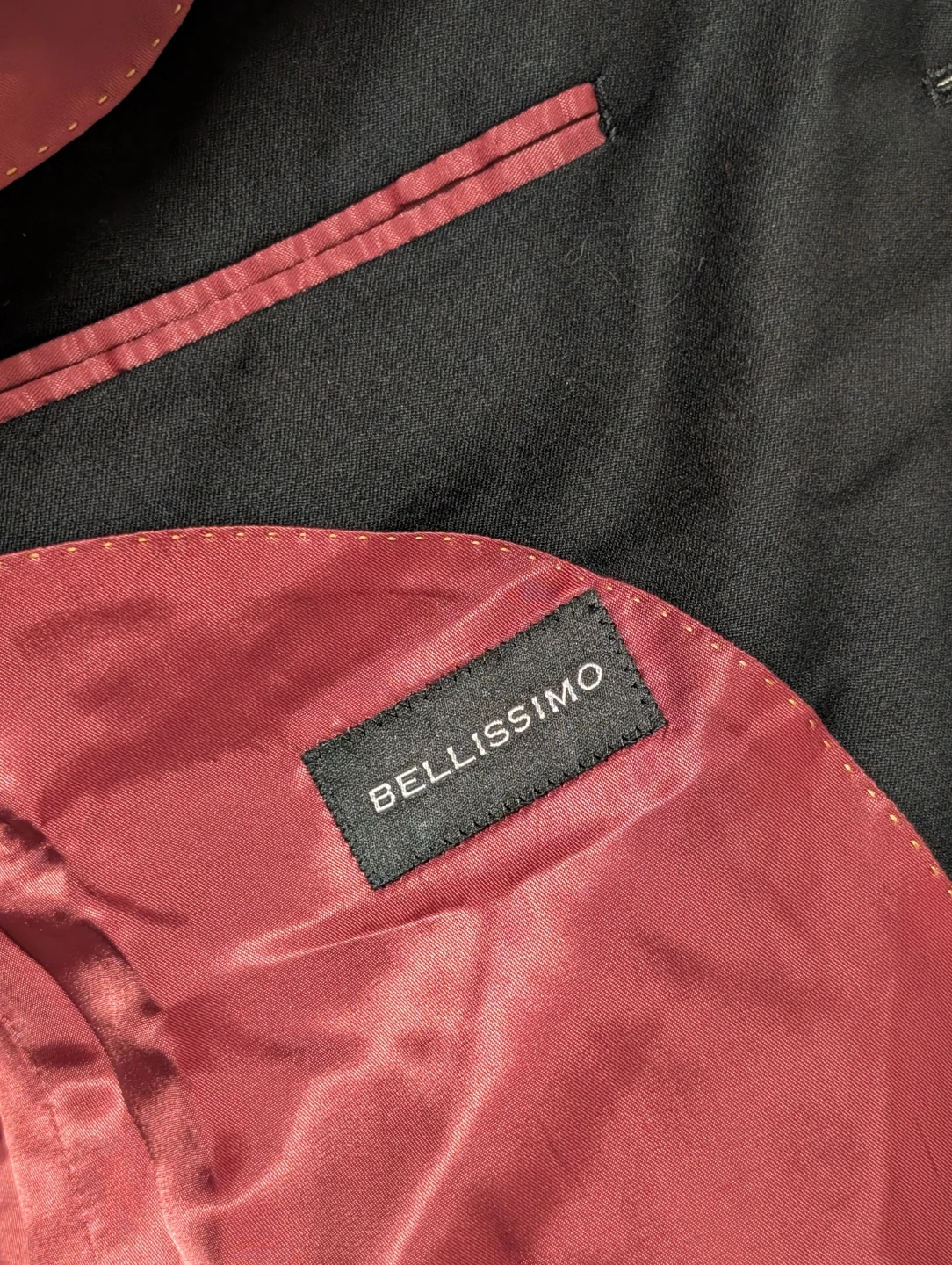 This is a Bellissimo blazer. It's made of 100% wool and 100% Laine. The size is 46T Tall.