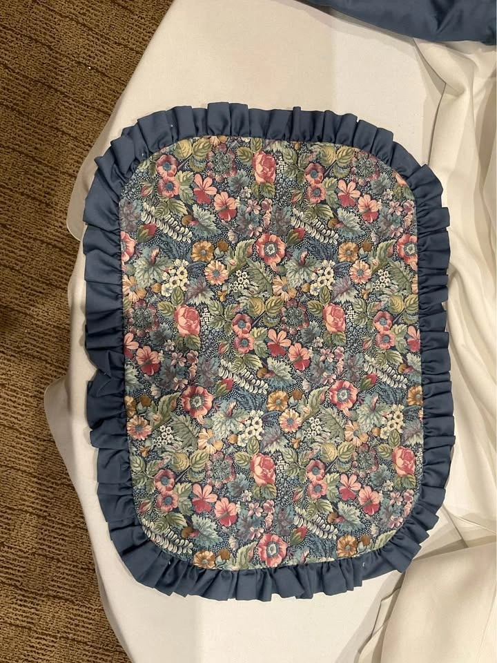 Pretty set of 4 placemats with a lovely multi-color floral pattern in blue, pink, and green tones on a dark blue background. Each placemat has a dark blue ruffled border. Size 18" x 13 1/2". Washed & Pressed. Smoke & Pet Free Home. Located Richmond Hill / Bathurst & King Rd.