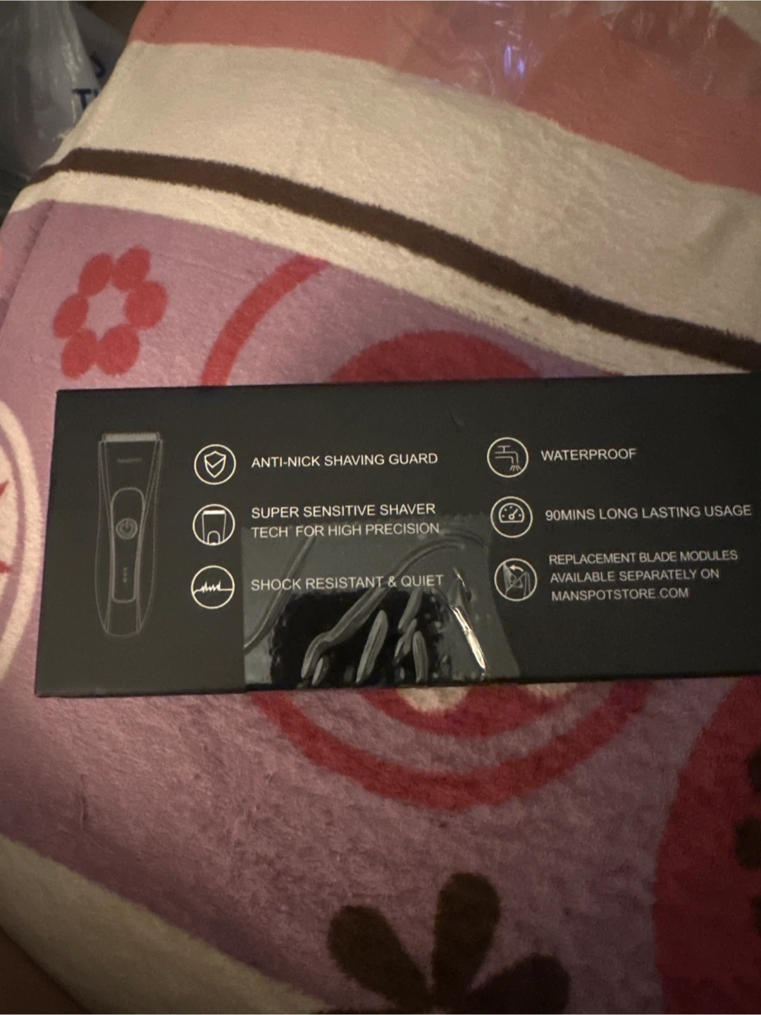 This is the MANSPOT Men's Premium Body Trimmer. It features an anti-nick shaving guard and is waterproof. It has 90 minutes of long-lasting usage on a full charge.