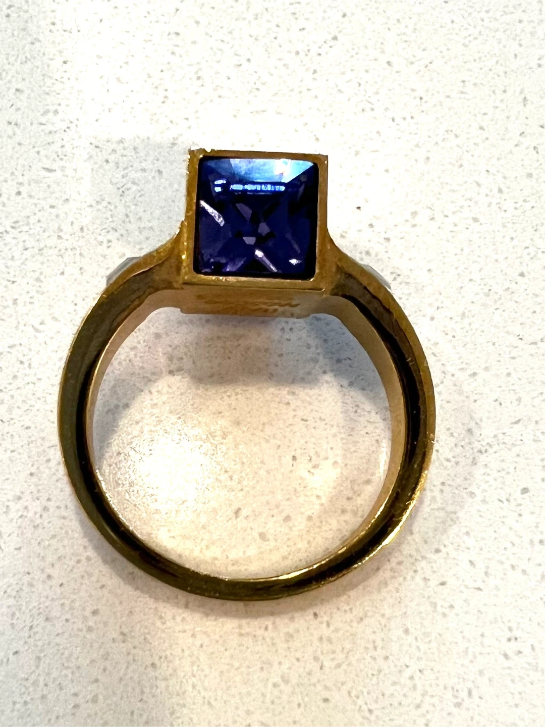 This ring features a prominent blue stone and the iconic LV logo. It's crafted in Italy and has additional smaller stones on the sides. The band is gold-toned.