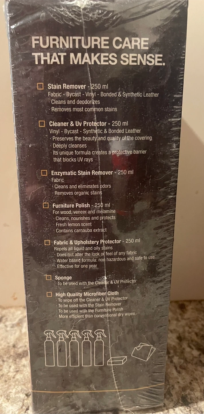 This kit includes a stain remover, cleaner & UV protector, enzymatic stain remover, furniture polish, and fabric & upholstery protector, all in 250 ml bottles. It also comes with a high-quality microfiber cloth and a sponge. The formula is water-based and non-hazardous for safe use on furniture.