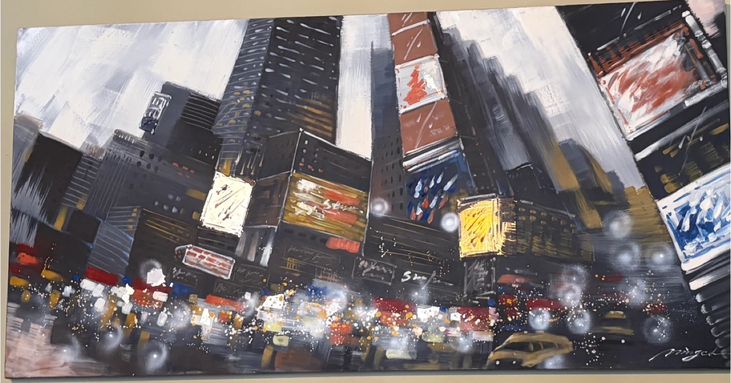 This is a vibrant, abstract painting depicting a bustling cityscape, likely inspired by Times Square. It uses bold strokes and a dynamic colour palette to capture the energy of the city at night. The artwork showcases tall buildings with illuminated signs and streaks of light from traffic below. Signed by the artist "Miyagaki" on the lower right.