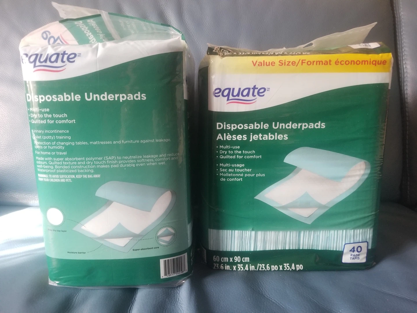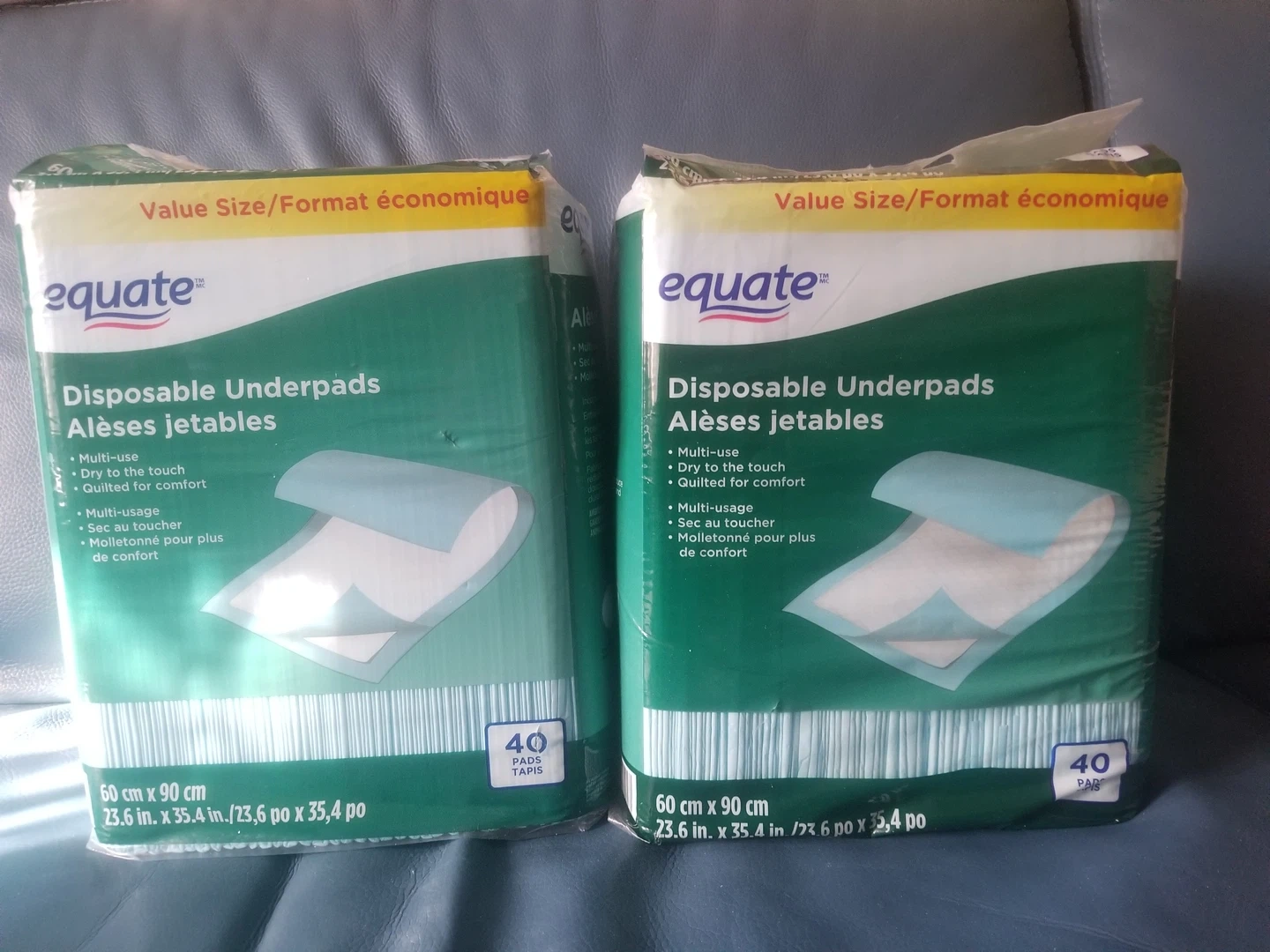 Brand new, unopened packs of Equate Large Disposable Underpads from Walmart. Great quality at a lower price than other brands!