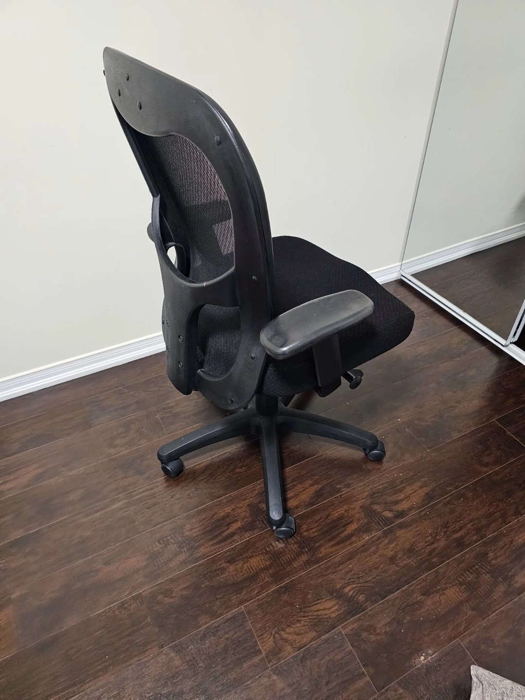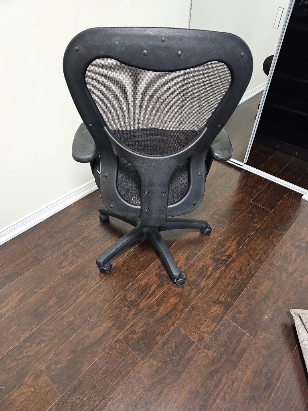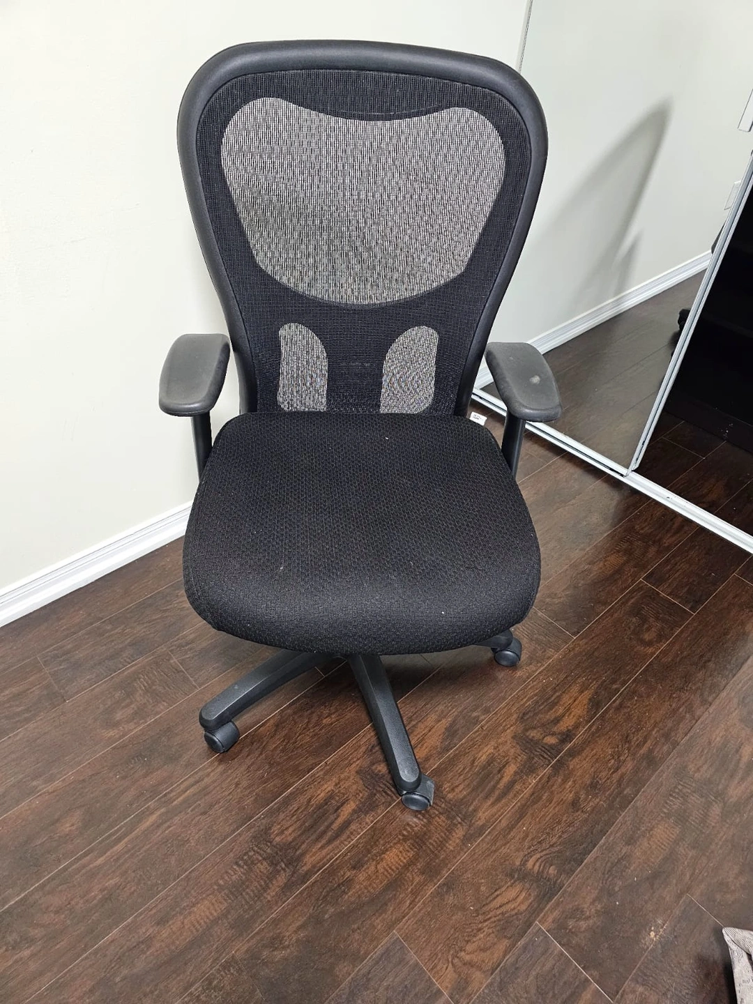 Black mesh office chair with adjustable height. It swivels and has five wheels. The chair is in good condition. It is very comfortable.