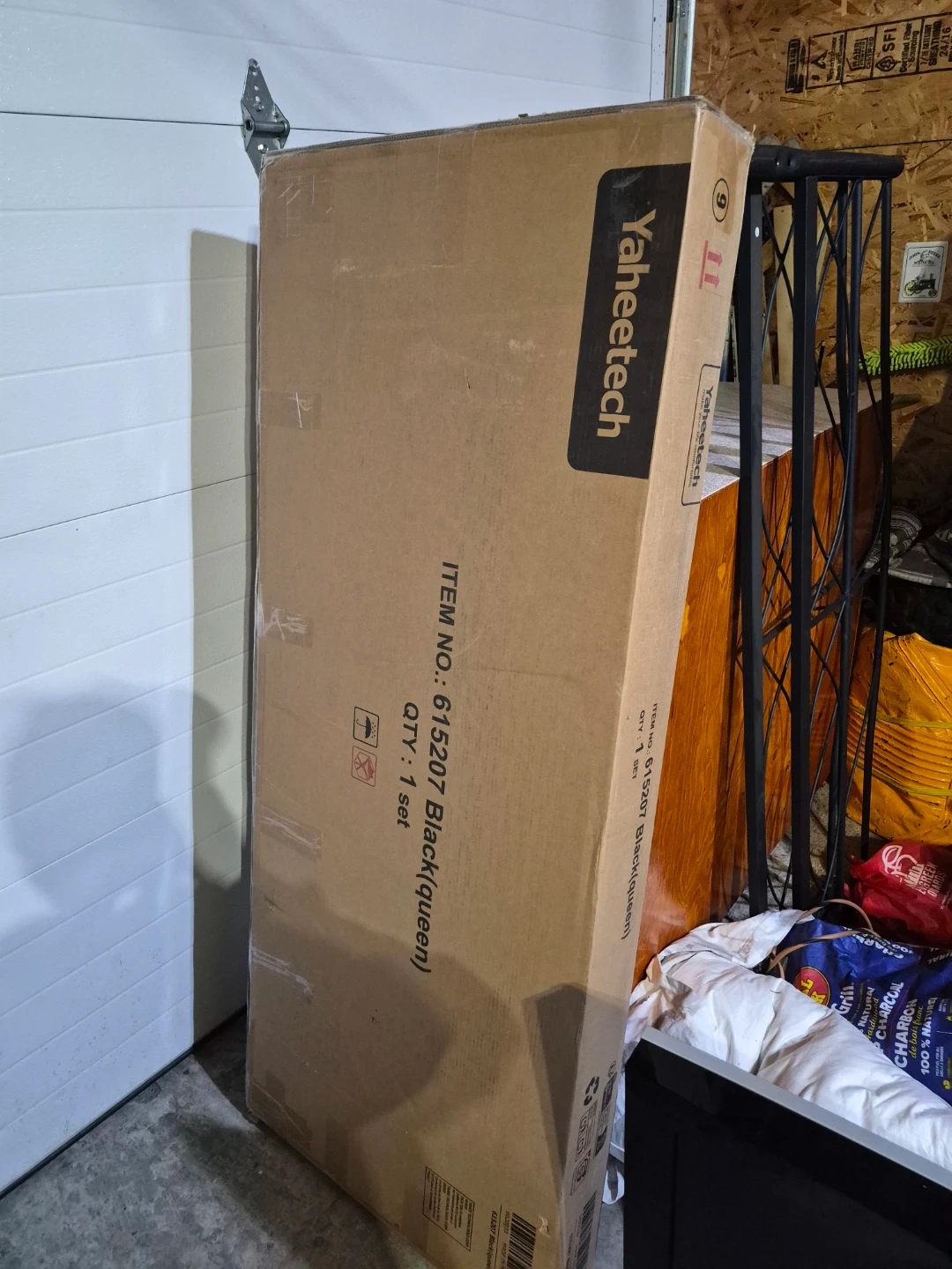 This is a new Yaheetech upholstered bed frame in black, queen size. It's still in its original packaging. This bed frame comes with channel tufted headboard.