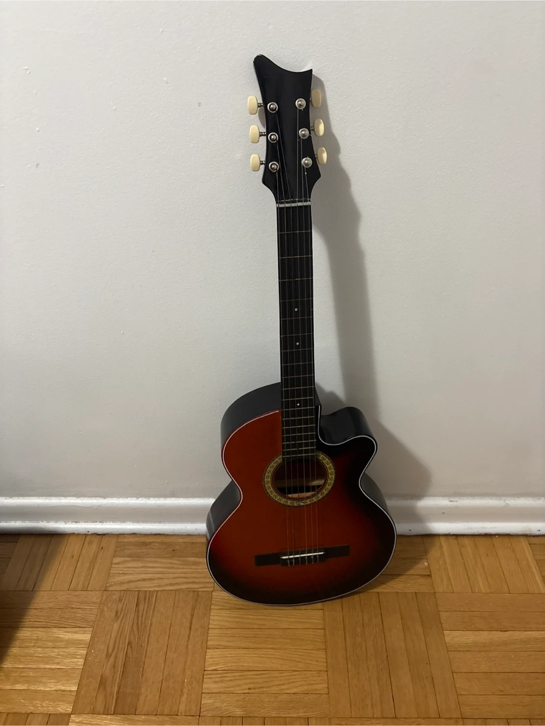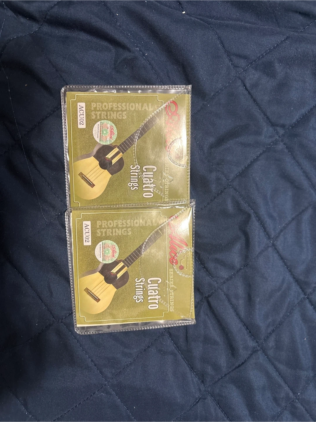 This is a black acoustic guitar. It comes with a gig bag and two sets of Cuatro strings. It's ready for some music!