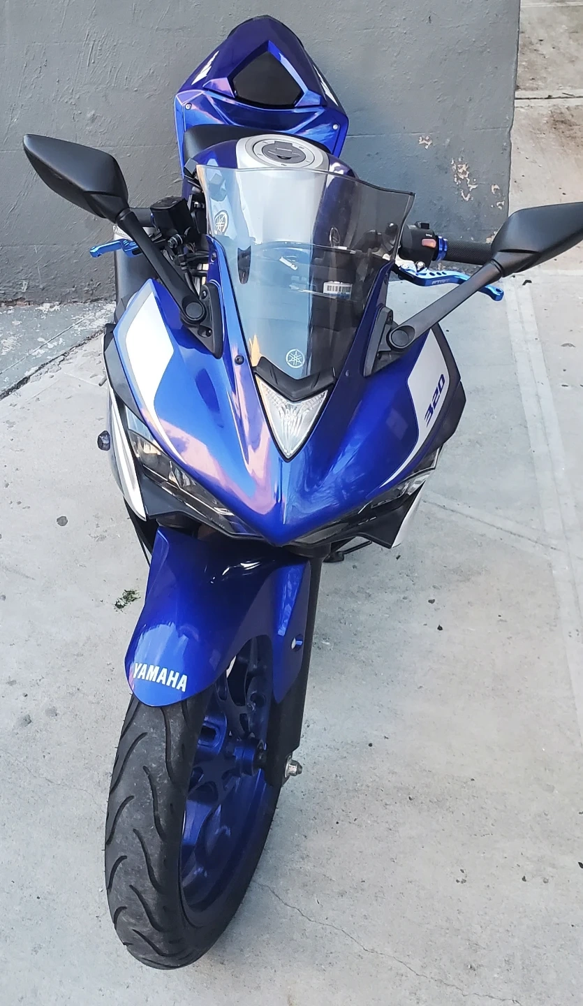 Yamaha R3 sportbike in a striking blue and silver color scheme. It features a sleek design and a 320cc engine. Perfect for riders looking for a nimble and responsive machine!