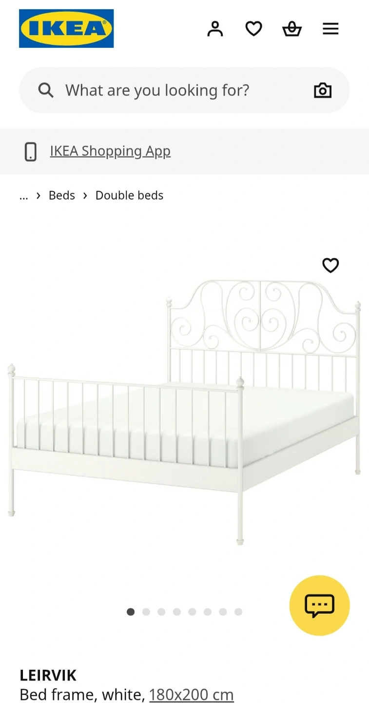 This is an IKEA LEIRVIK metal bed frame in white. It's a double size, featuring a decorative design in the head and footboard. This frame would be great for a bedroom looking for a classic, elegant touch.
