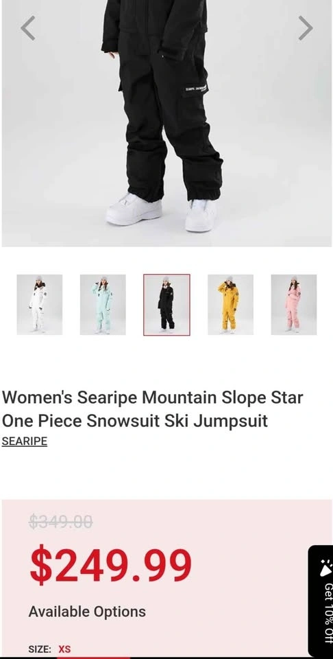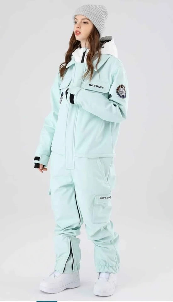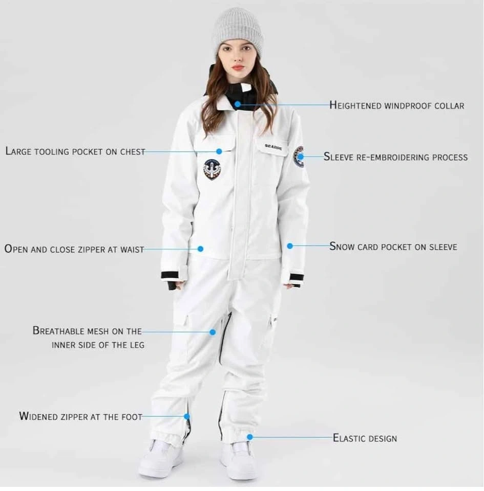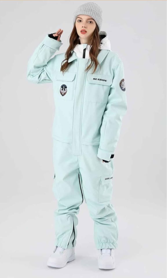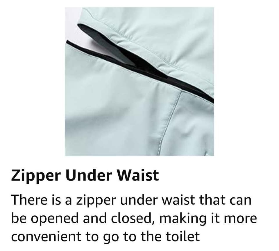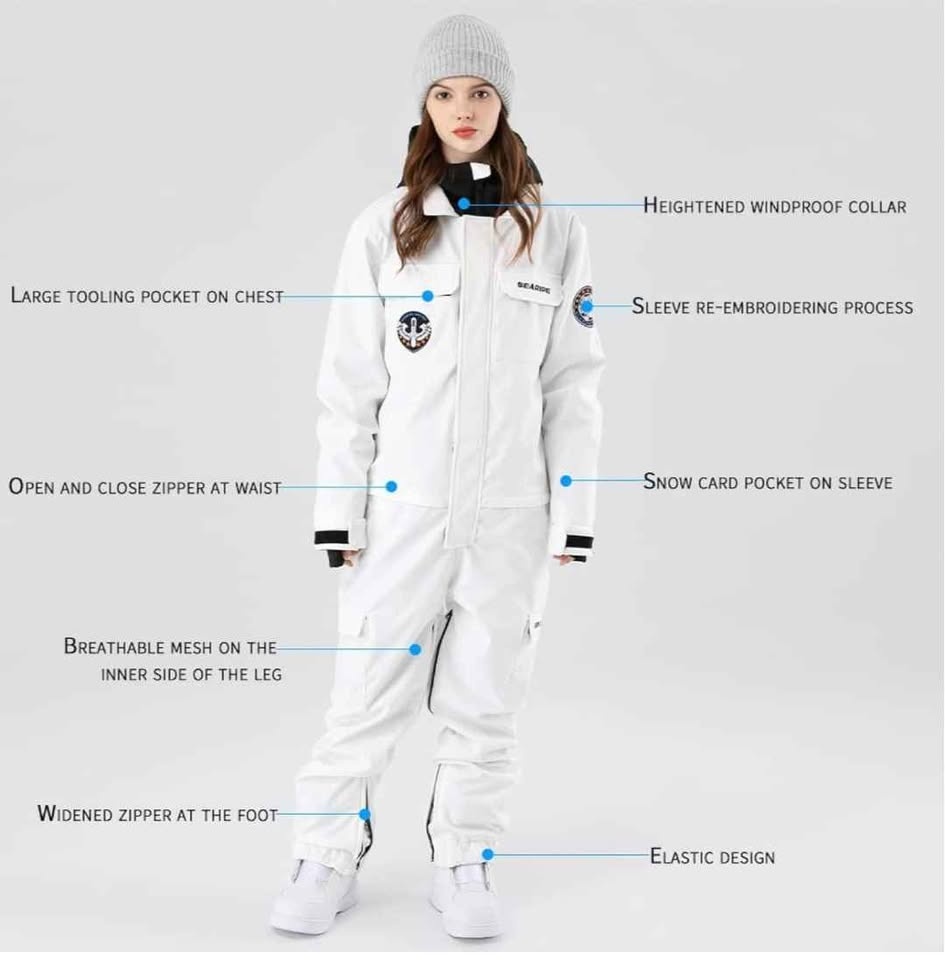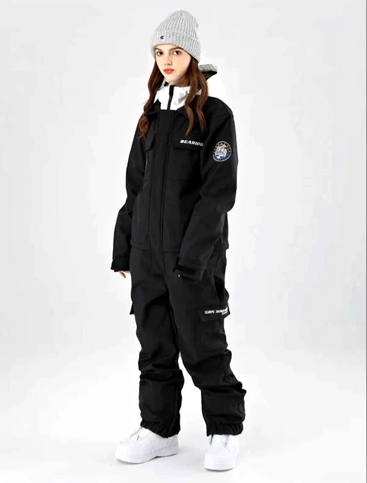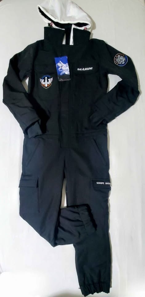 One piece ski suit. Zipper under waist line for easy toilet use. Designed For: Snow sports (Skiing/Snowboarding/Ice-Skating). Colour: Black. Size: X-S (Extra Small). Shell Fabric & Lining Material: 100% Polyester. Insulation: Advanced Skin Warm Insulated. Membrane: 10K Waterproof / 10K Breathable. Pockets: 2 Chest Pockets, Sleeve Pocket, 2 Pants Pockets, 2 Functional Cargo Pockets. Vents: Inner Leg Vents. Additional Features: Waist Zipper Convenient for Toilet, Adjustable Cuffs with Velcro, Fully Taped Seams, Leg Maximizer Zipper, Elastic Legging.