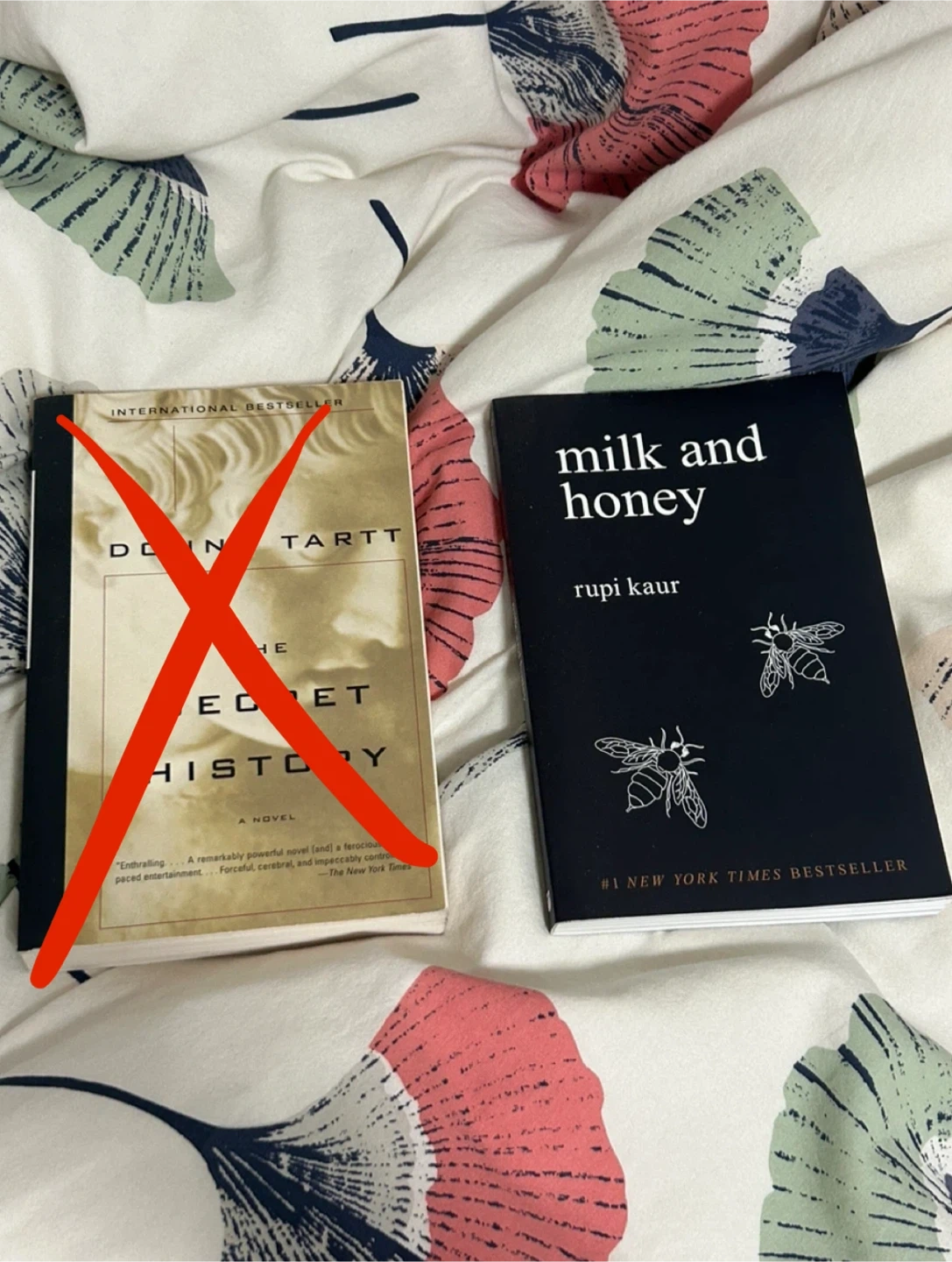 Selling two books: - (SOLD) The Secret History by Donna Tartt ($15) usually sells for ($24)+tax (SOLD) - Milk and Honey by Rupi Kaur ($13) usually sells for ($20)+tax