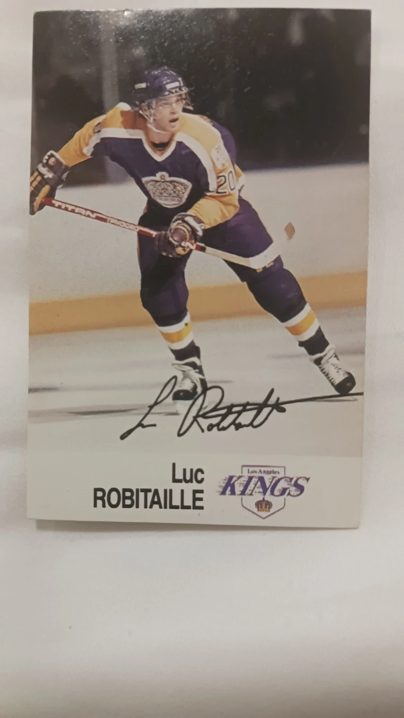 This is a Luc Robitaille hockey card from the Esso NHL All-Star Collection. It's from the 1980s era. It has a checklist on the back and an image of the player in his Los Angeles Kings uniform. The Last photo is for comparison!