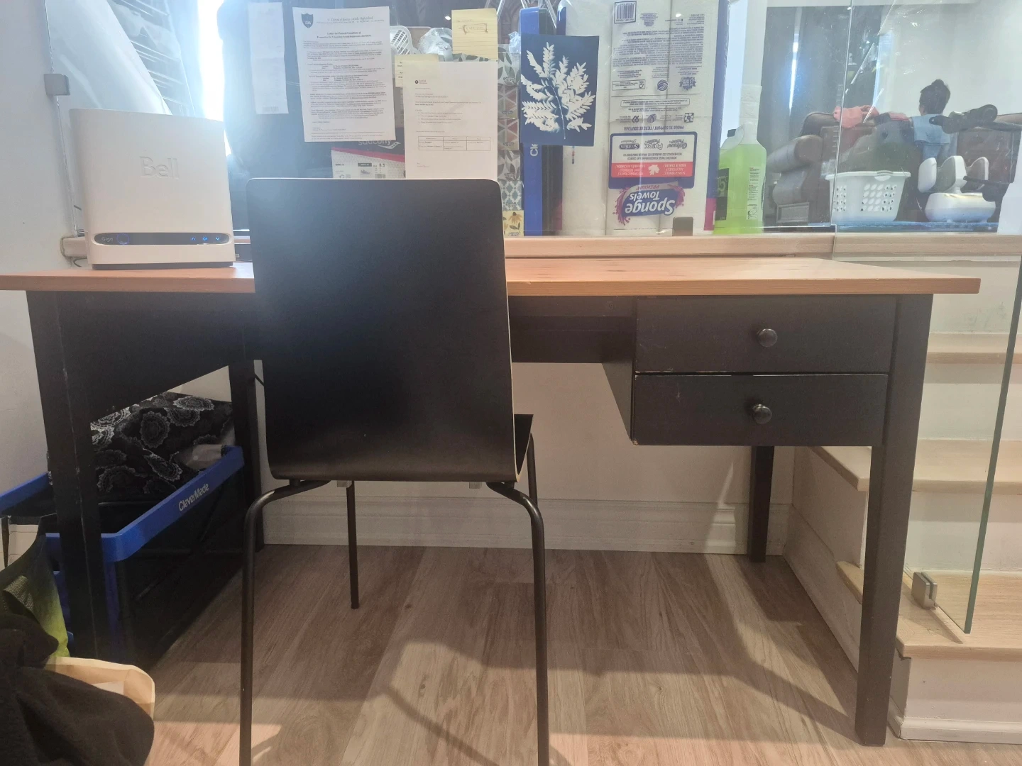 This desk has a natural wood top and a black base with two drawers. It's perfect for a home office or study space. The drawers offer convenient storage for your essentials.