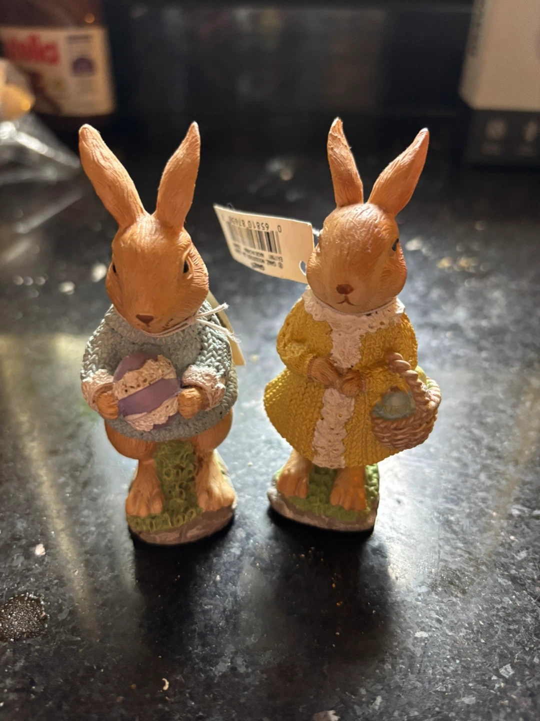 Set of two decorative Easter bunny figurines. One bunny holds a speckled egg, and the other carries a basket filled with small eggs. Both wear charming outfits, adding a festive touch to your spring decor. These figurines are perfect for your Easter celebrations! In excellent condition!