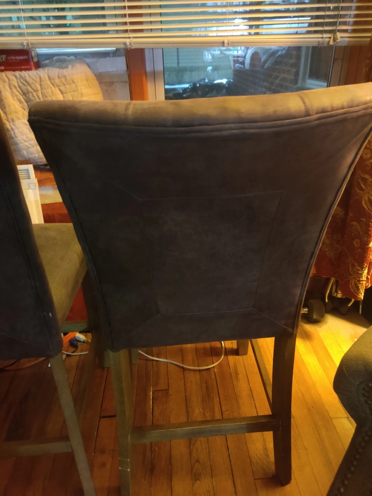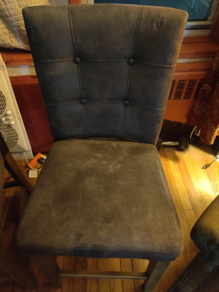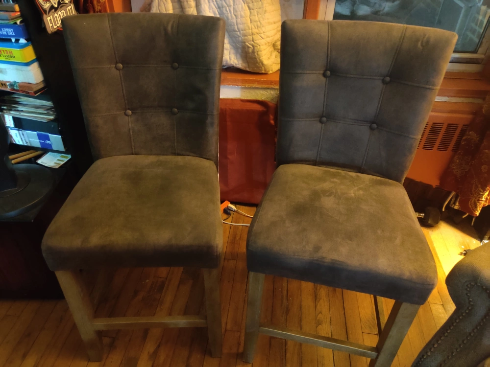 Selling a set of three bar stools with dark brown tufted upholstery. They feature wooden legs and a comfortable padded seat and back. These stools would be a great addition to a kitchen island or home bar!.. no rips or discoloration..legs do not wabble there solid strong