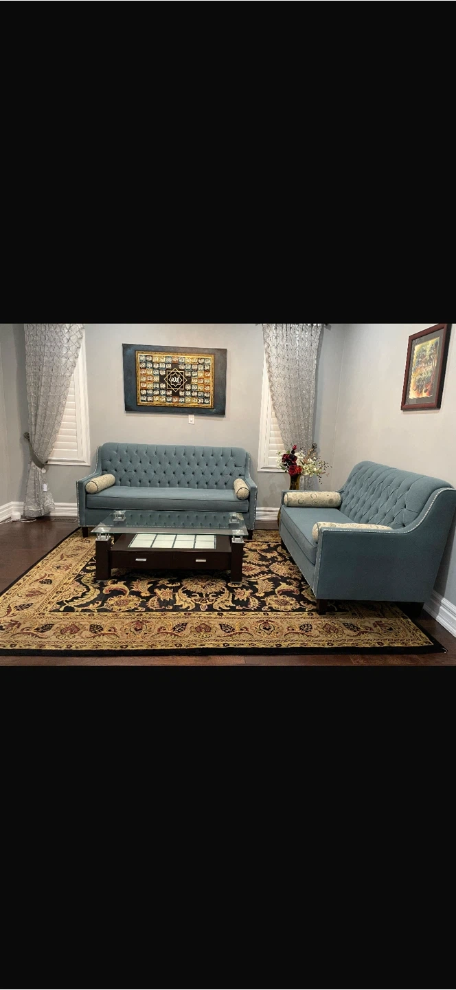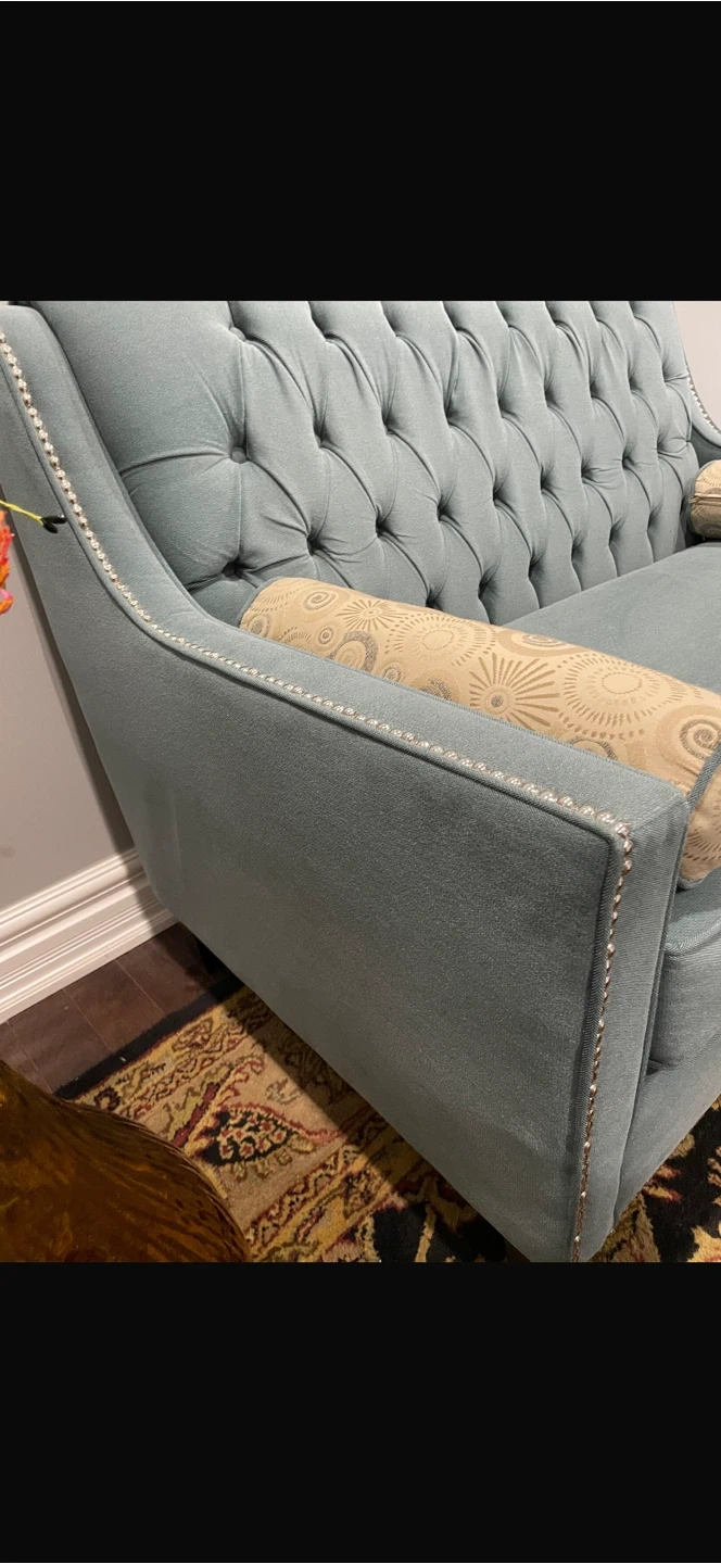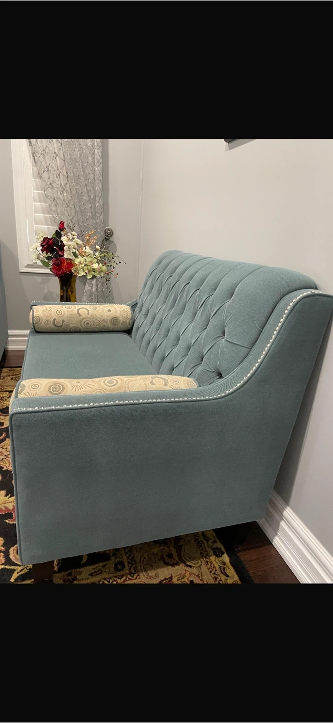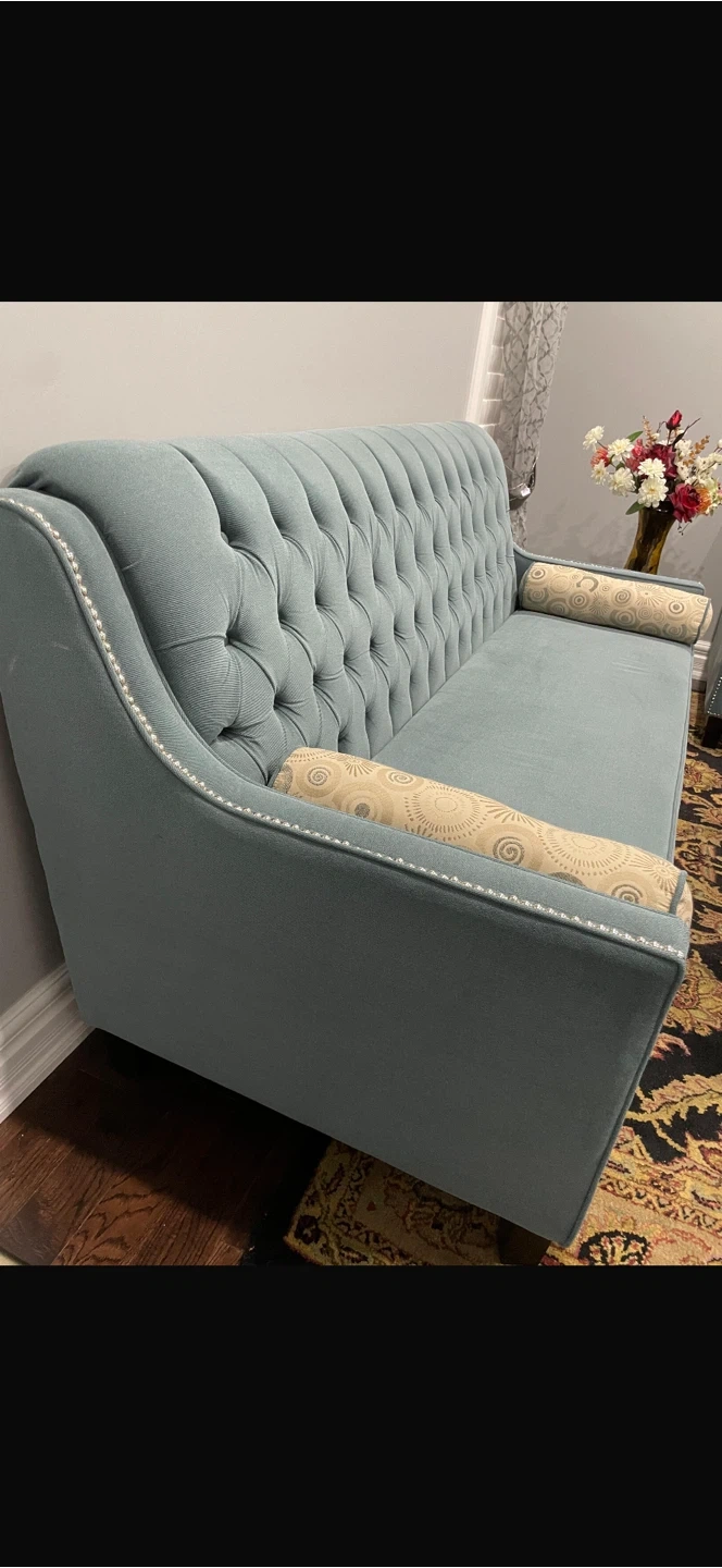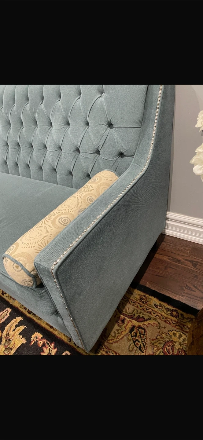 Stylish light blue sofa featuring deep button tufting on the backrest. It comes with two decorative bolster pillows. This piece has a classic look with nailhead trim along the arms and back. Adds a touch of elegance to any living space.