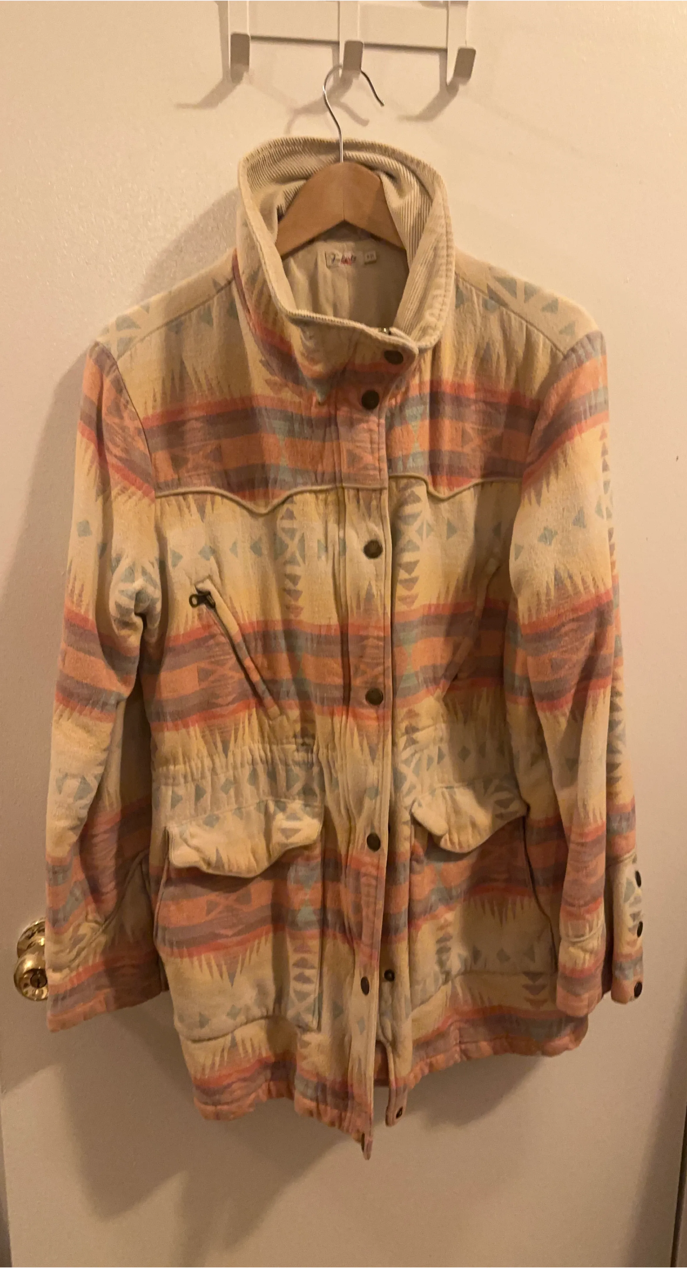 Here's a Tolani jacket with a unique Aztec print! It's in good condition and ready for a new owner. The jacket features a corduroy collar and a full button front. Perfect for adding a pop of color and pattern to your wardrobe!