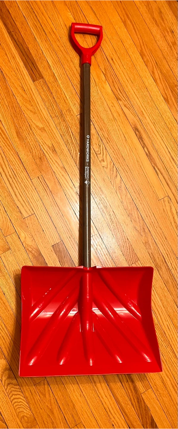 This red snow shovel features a durable plastic blade and a sturdy metal handle with a comfortable grip. It's perfect for clearing snow this winter. The shovel has a wide blade to move more snow with each scoop.