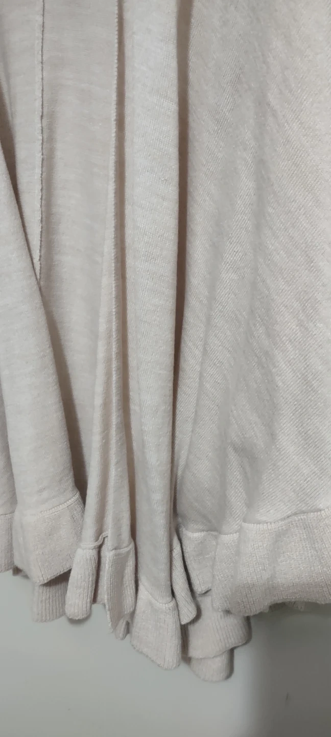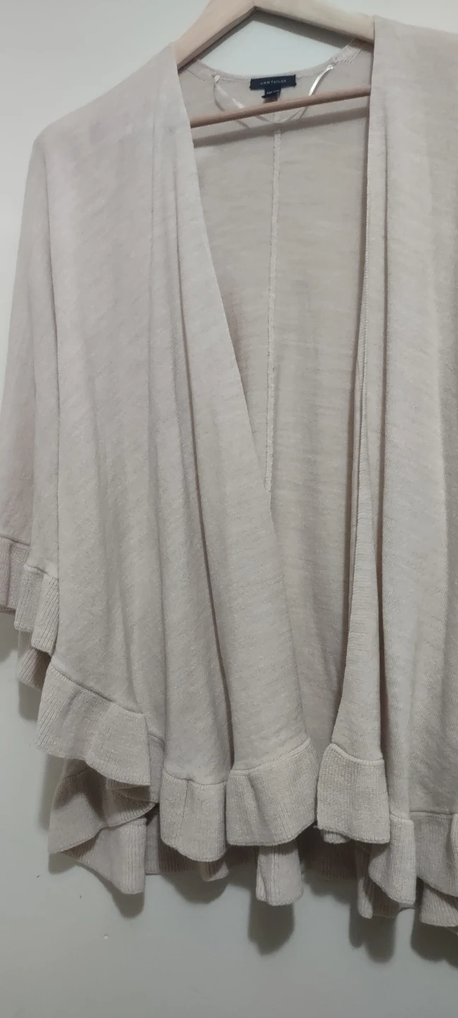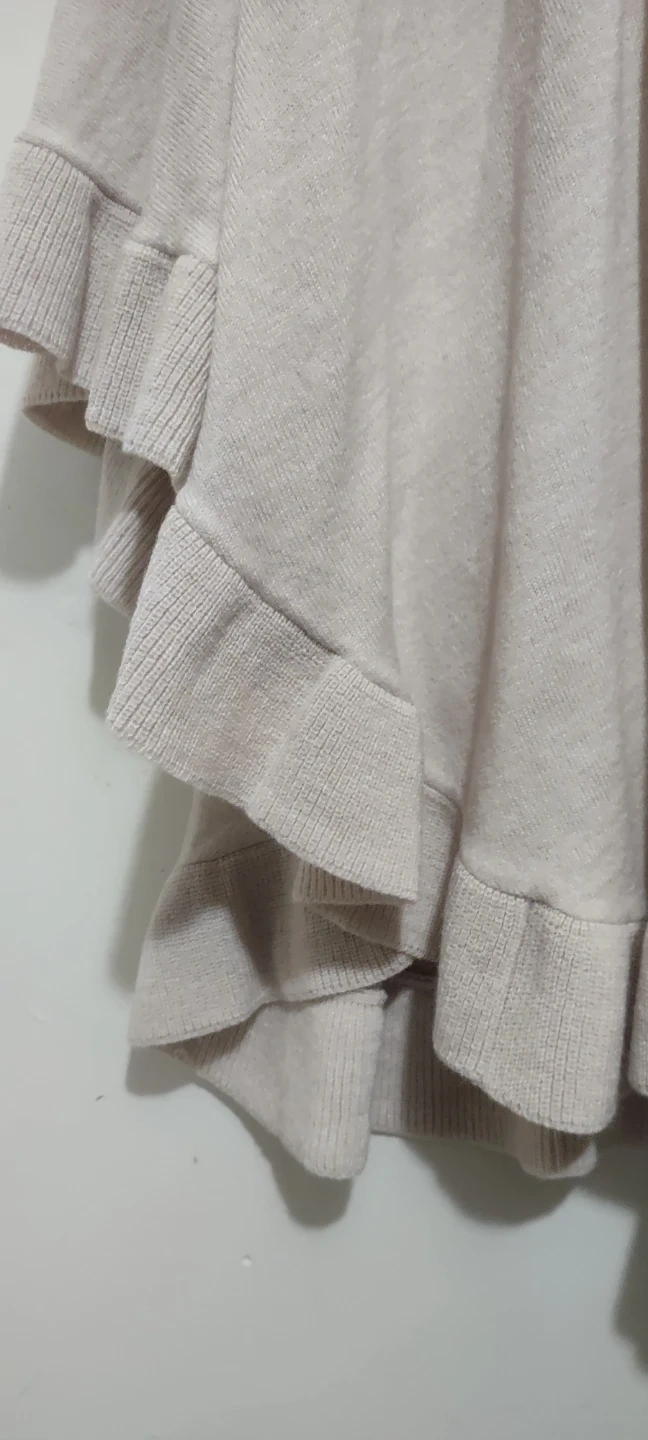 Here's a comfy shawl from Ann Taylor. It's a one-size-fits-all piece, perfect for layering. The material is soft and the ruffled hem adds a touch of elegance.