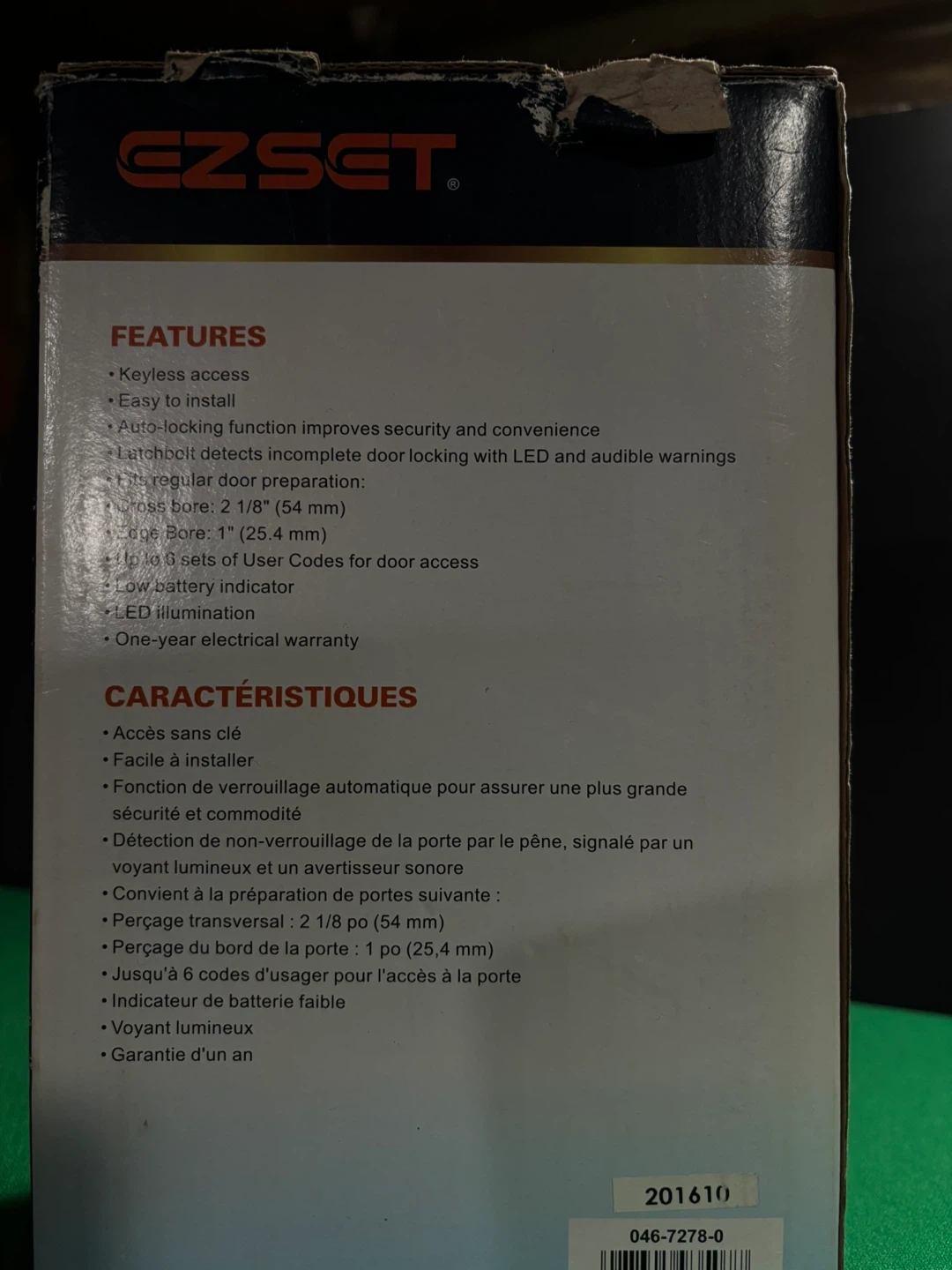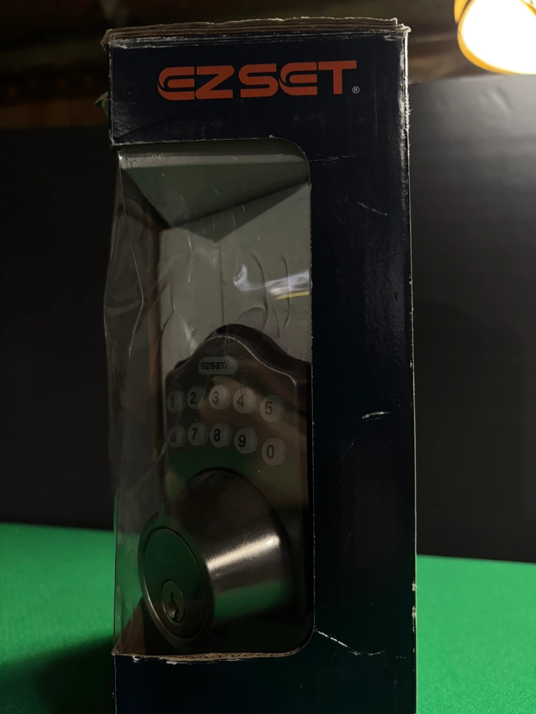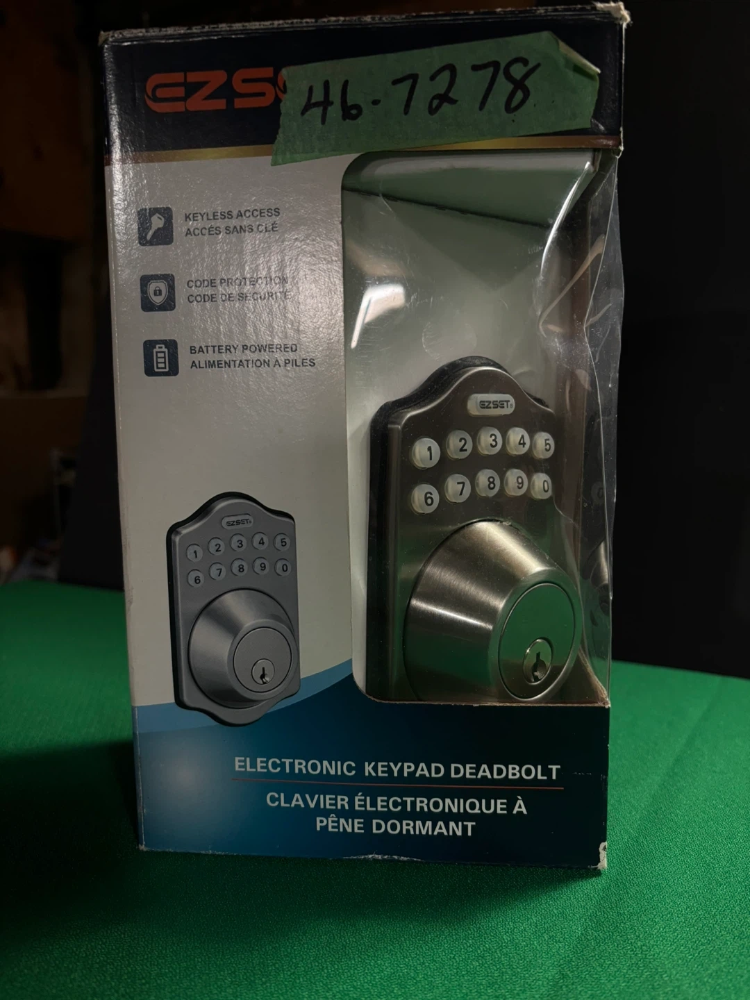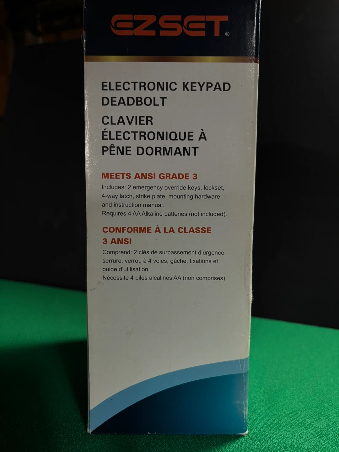 EZSET electronic keypad deadbolt for keyless entry. It meets ANSI Grade 3 standards and includes 2 emergency override keys, a latchset, strike plate, mounting hardware, and instruction manual. Requires 4 AA alkaline batteries, which are not included.