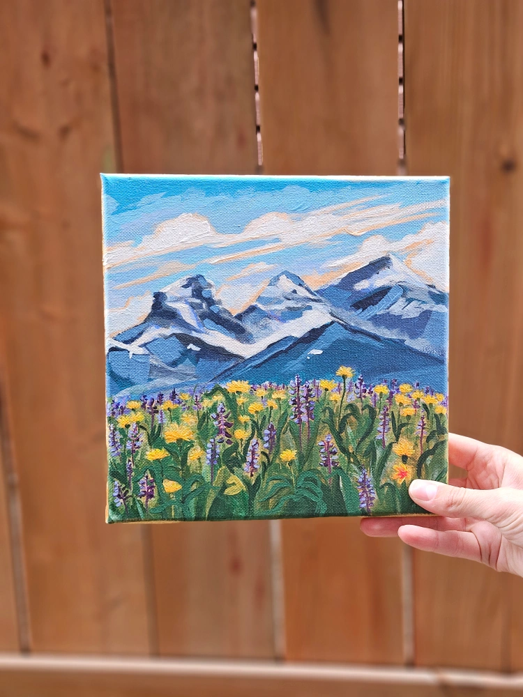 Small canvas painting. Features a mountain range and wildflowers. Painted with acrylics. Unique piece.