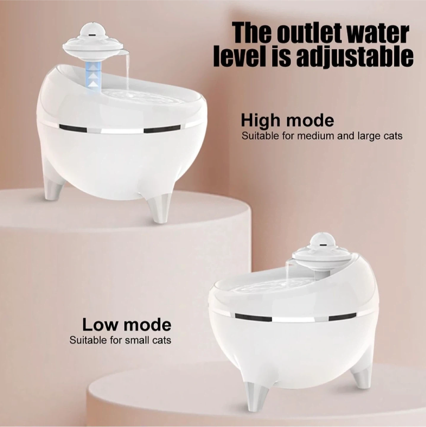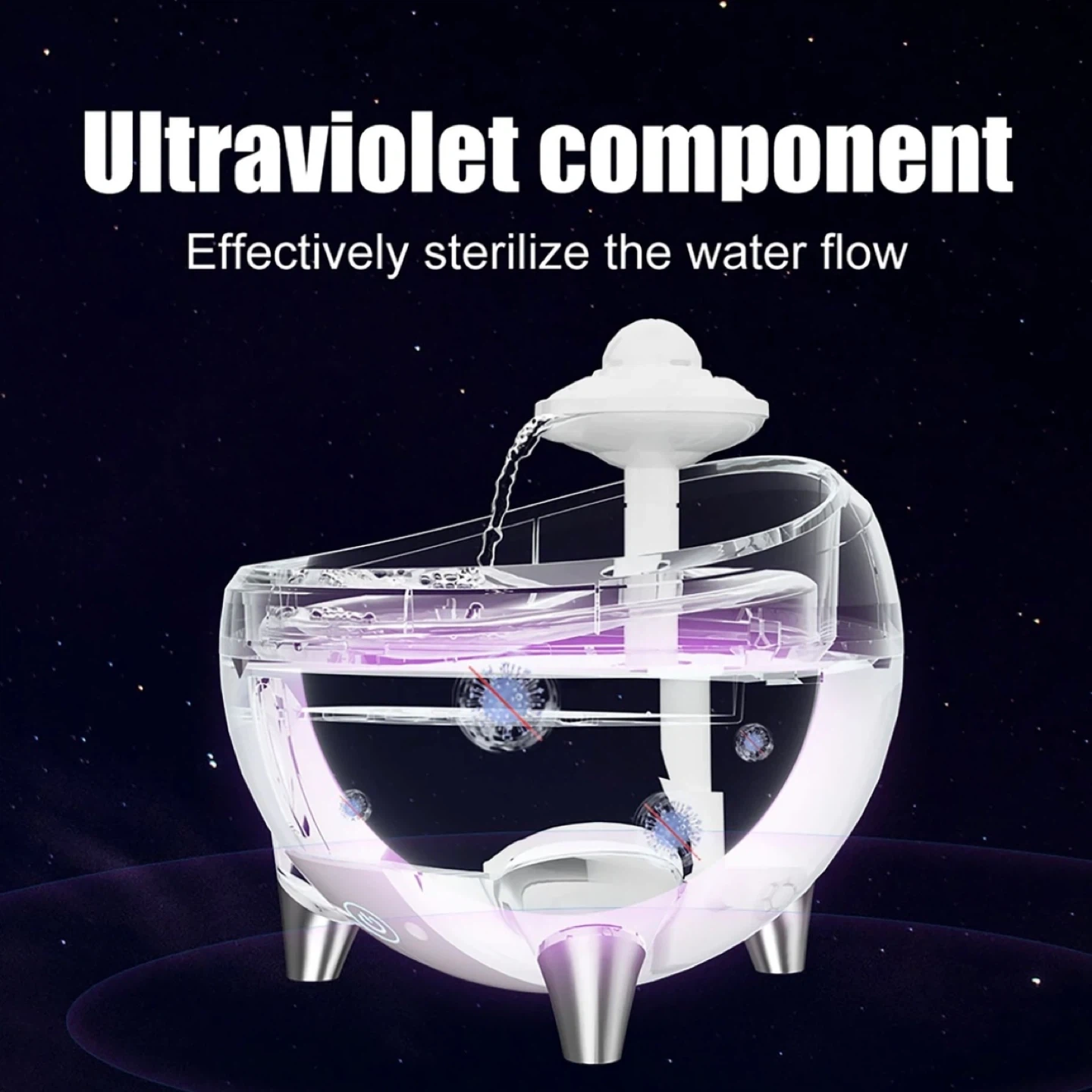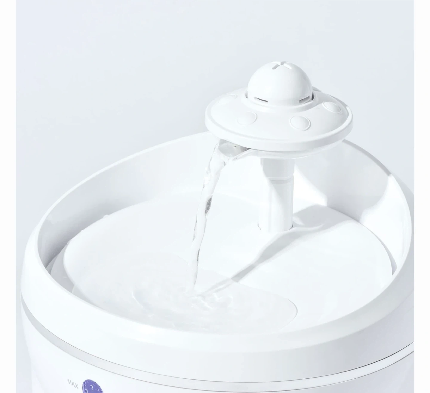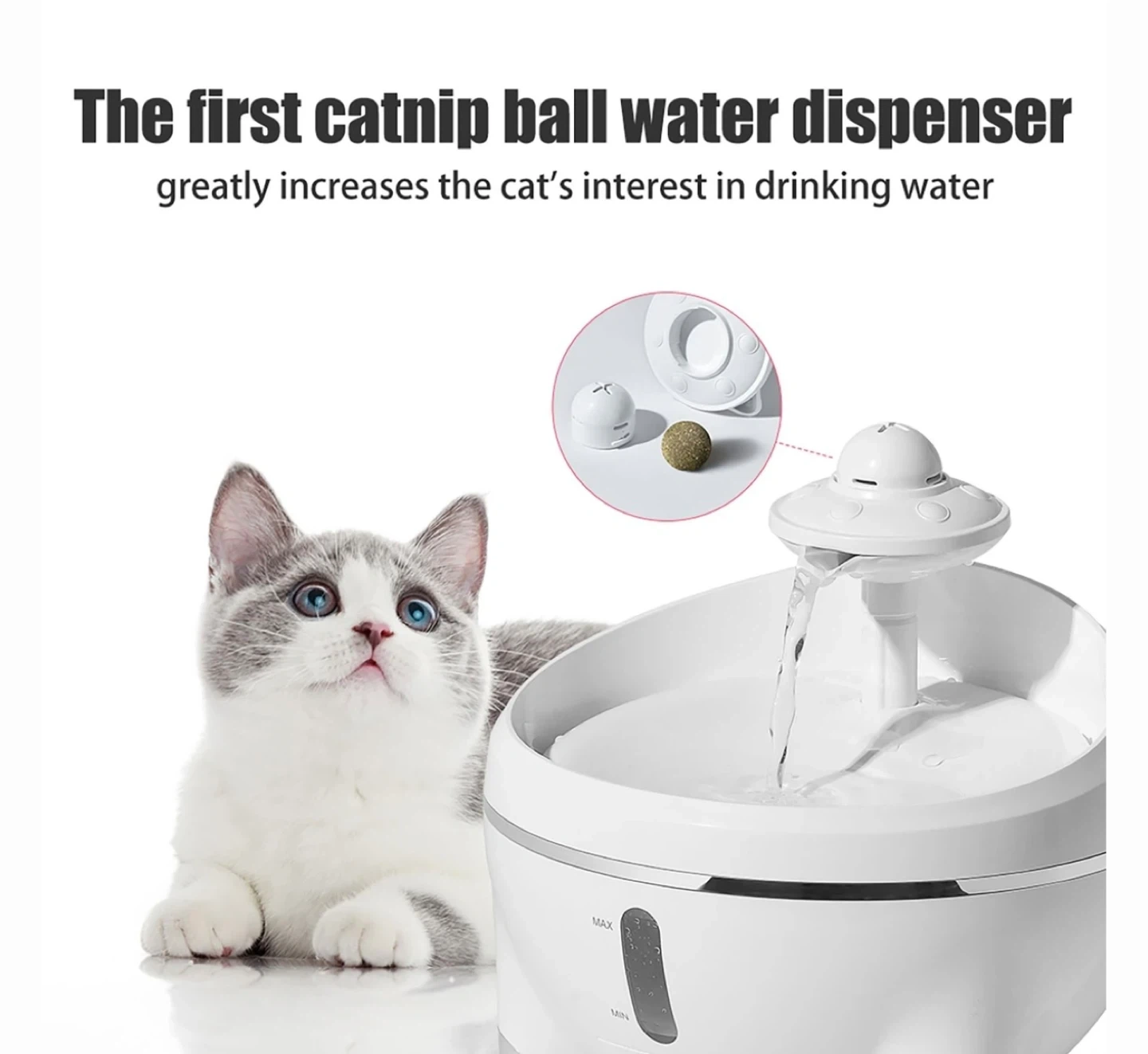 This automatic water fountain is designed for cats. It features a catnip ball to increase interest in drinking water. The outlet water level is adjustable for different cat sizes. It also has an ultraviolet component to sterilize the water flow. The pump is ultra silent, operating at less than 30dB.